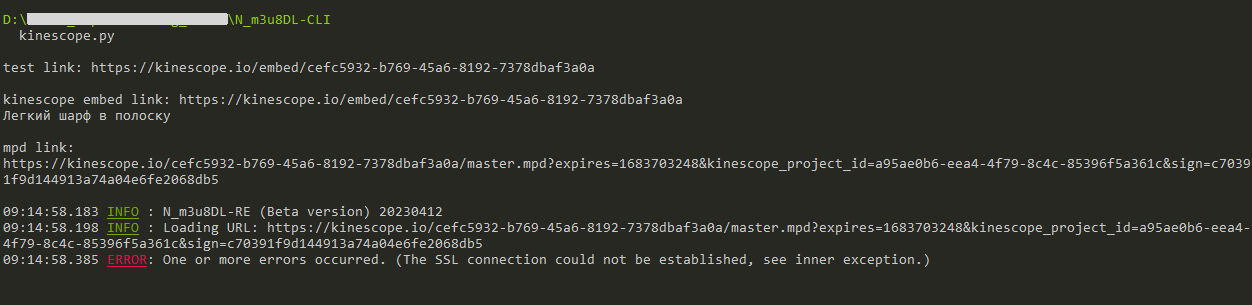 Code:import requests import re import subprocess m3u8DL_RE = 'N_m3u8DL-RE.exe' print('\ntest link: https://kinescope.io/embed/cefc5932-b769-45a6-8192-7378dbaf3a0a') link = input('\nkinescope embed link: ') headers = { 'authority': 'kinescope.io', 'referer': link, 'user-agent': 'Mozilla/5.0 (Windows NT 10.0; WOW64) AppleWebKit/537.36 (KHTML, like Gecko) Chrome/102.0.0.0 Safari/537.36', } resp = requests.get(link, headers=headers).text try: title = re.findall(r'<title>(.*?)</title>', resp)[0].strip() print(title) except IndexError: title = input('video title: ') dash = re.findall(r'dash: {\"src\":\"(.*?)\"', resp)[0].strip() dash = re.sub(r'\\u0026', r'&', dash) print(f'\nmpd link:\n{dash}\n') subprocess.run([m3u8DL_RE, '--concurrent-download', '-H', 'referer: '+link+'', '--auto-select', '--log-level', 'INFO', '--del-after-done', '-M', 'format=mp4:muxer=ffmpeg', '--save-name', title, dash])