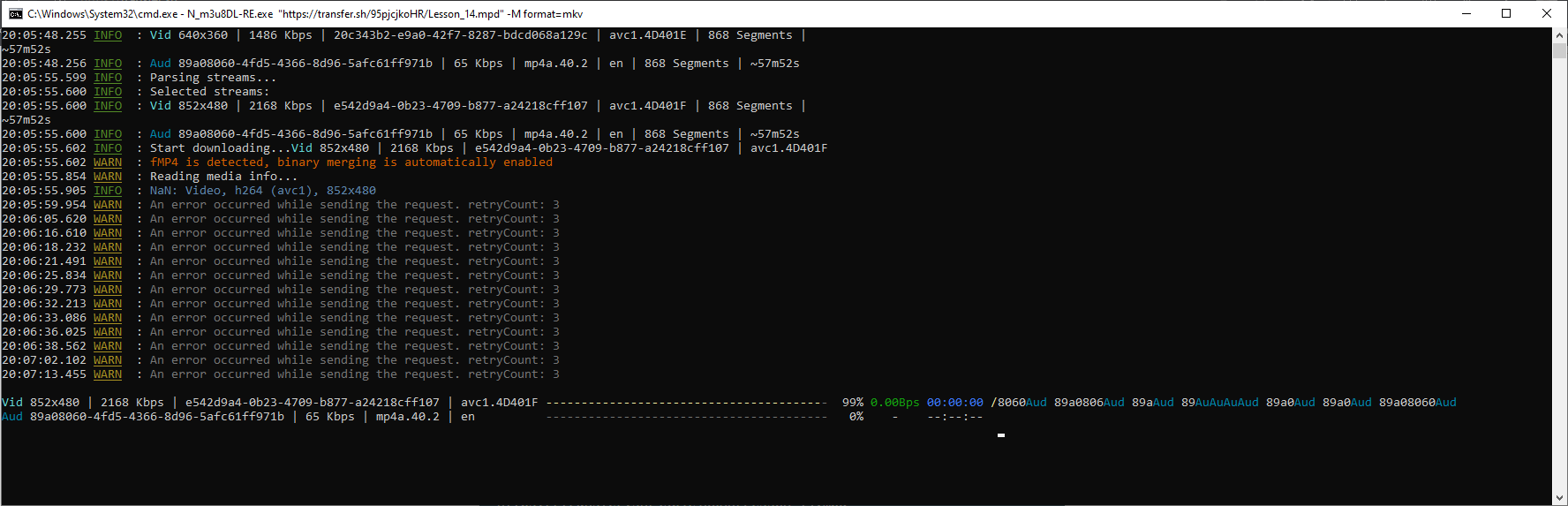 I can’t find the keys on the video https://kinescope.io/200586210 and I use a clear key file as per the instructions, last year I downloaded the video according to your instructions for example - N_m3u8DL-RE.exe "https://kinescope.io/video_number/master .mpd" --key 4471575a47353361466573754734493d:724a6451454665313 4366d4478756f3d -M format=mkv