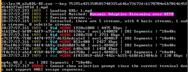 20:37:57.315 INFO : Vid *CENC 1920x1080 | 4475 Kbps |b16228e2-bf09-4df9-a75e-daf819f67dce | avc1.640028 | 282 Segments | ~18m48s