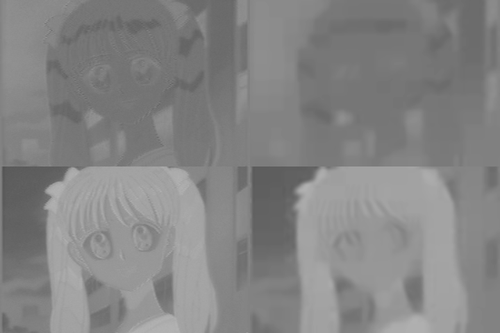 There's much less damage to the chroma. Clip1.mkv, U (top) and V (bottom) planes, original on left, after FFT3DFilter(sigma=40.00,plane=3) on the right:Code:############################################################################## # # DeRainbow(clip c, int "threshold", int "bfactor") # # Rainbows are caused by high frequency luma interfering with the chroma # carrier. So luma edges are where you will get rainbows (high frequency # noise in the luma channels). They are removed here by blurring the chroma. # Only areas near edges are blurred. # # threshold default 40 # Edge detection threshold. This basically controls what parts of the picture # will be processed. Lower values will result in removal of rainbows in # more and wider areas but potentially blurring of the chroma in those areas. # Valid values are 0 to 255. Typical values are probably 20 to 60. Use the # highest value you can and still get removal of rainbows in the areas you # want. # # bfactor, default 4 # Blur factor. Higher values more effectivly remove rainbows but may # also result in noticably blurred colors and loss of saturation of small # patches and edges. Valid values are 1 and above. Typical values # are 4 to 8. Use the lowest values that gives effective rainbow removal. # ############################################################################## function DeRainbow(clip c, int "threshold", int "bfactor") { threshold = default(threshold, 40) bfactor = default(bfactor, 4) bwidth = (c.width/bfactor/8)*8 bwidth = max(bwidth, 16) bheight = (c.height/bfactor/8)*8 bheight = max(bheight, 16) umask = c.UtoY().mt_edge(mode="hprewitt", thy1=threshold, thy2=threshold) vmask = c.VtoY().mt_edge(mode="hprewitt", thy1=threshold, thy2=threshold) rmask = Overlay(umask, vmask, mode="add").mt_expand().Blur(1.4).Blur(1.4).Spline36Resize(c.width,c.height) #return(rmask) # if you want to see the edge mask cblur = c.BilinearResize(bwidth, bheight).KNLMeansCL(d=1, a=2, h=3, channels= "UV").Spline36Resize(c.width,c.height) # return(rblur) # if you want to see the blurred video cblur = Overlay(c, cblur, mask=rmask) MergeChroma(c, cblur) } ##############################################################################