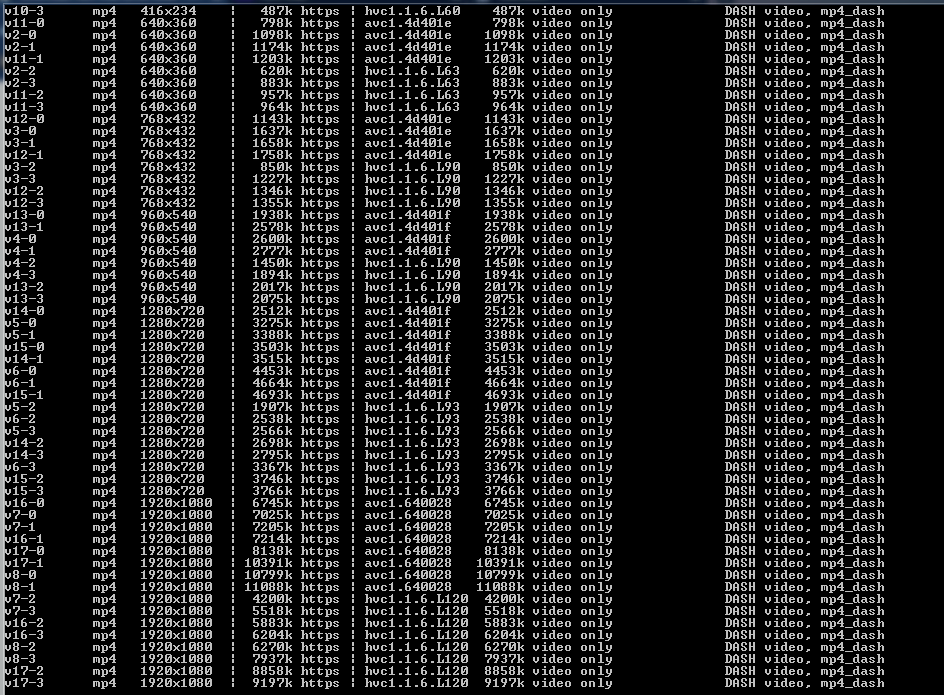 Code:ID EXT RESOLUTION FPS │ TBR PROTO │ VCODEC VBR ACODEC ABR ASR MORE INFO ──────────────────────────────────────────────────────────────────────────────────────────────────────────────────────────────────────────── thumbnails mhtml unknown │ mhtml │ images DASH storyboards (jpeg) audio-es-419-aac64-es-419 m4a audio only │ 78k dash │ audio only mp4a.40.5 78k 48k [es-419] DRM, DASH audio, m4a_dash avc-sdr-180p-30fps-200kbps mp4 320x180 30 │ 233k dash │ avc1.64000d 233k video only DRM, DASH video, mp4_dash avc-sdr-198p-30fps-300kbps mp4 352x198 30 │ 335k dash │ avc1.64000d 335k video only DRM, DASH video, mp4_dash avc-sdr-234p-30fps-450kbps mp4 416x234 30 │ 489k dash │ avc1.64000d 489k video only DRM, DASH video, mp4_dash avc-sdr-288p-30fps-700kbps mp4 512x288 30 │ 744k dash │ avc1.640015 744k video only DRM, DASH video, mp4_dash avc-sdr-360p-30fps-1100kbps mp4 640x360 30 │ 1153k dash │ avc1.64001e 1153k video only DRM, DASH video, mp4_dash avc-sdr-450p-30fps-1650kbps mp4 800x450 30 │ 1715k dash │ avc1.64001f 1715k video only DRM, DASH video, mp4_dash avc-sdr-576p-30fps-2500kbps mp4 1024x576 30 │ 2583k dash │ avc1.64001f 2583k video only DRM, DASH video, mp4_dash avc-sdr-720p-30fps-3800kbps mp4 1280x720 30 │ 3912k dash │ avc1.64001f 3912k video only DRM, DASH video, mp4_dash avc-sdr-720p-60fps-6000kbps mp4 1280x720 60 │ 6160k dash │ avc1.640020 6160k video only DRM, DASH video, mp4_dash avc-sdr-1080p-60fps-10000kbps mp4 1920x1080 60 │ 10247k dash │ avc1.64002a 10247k video only DRM, DASH video, mp4_dash