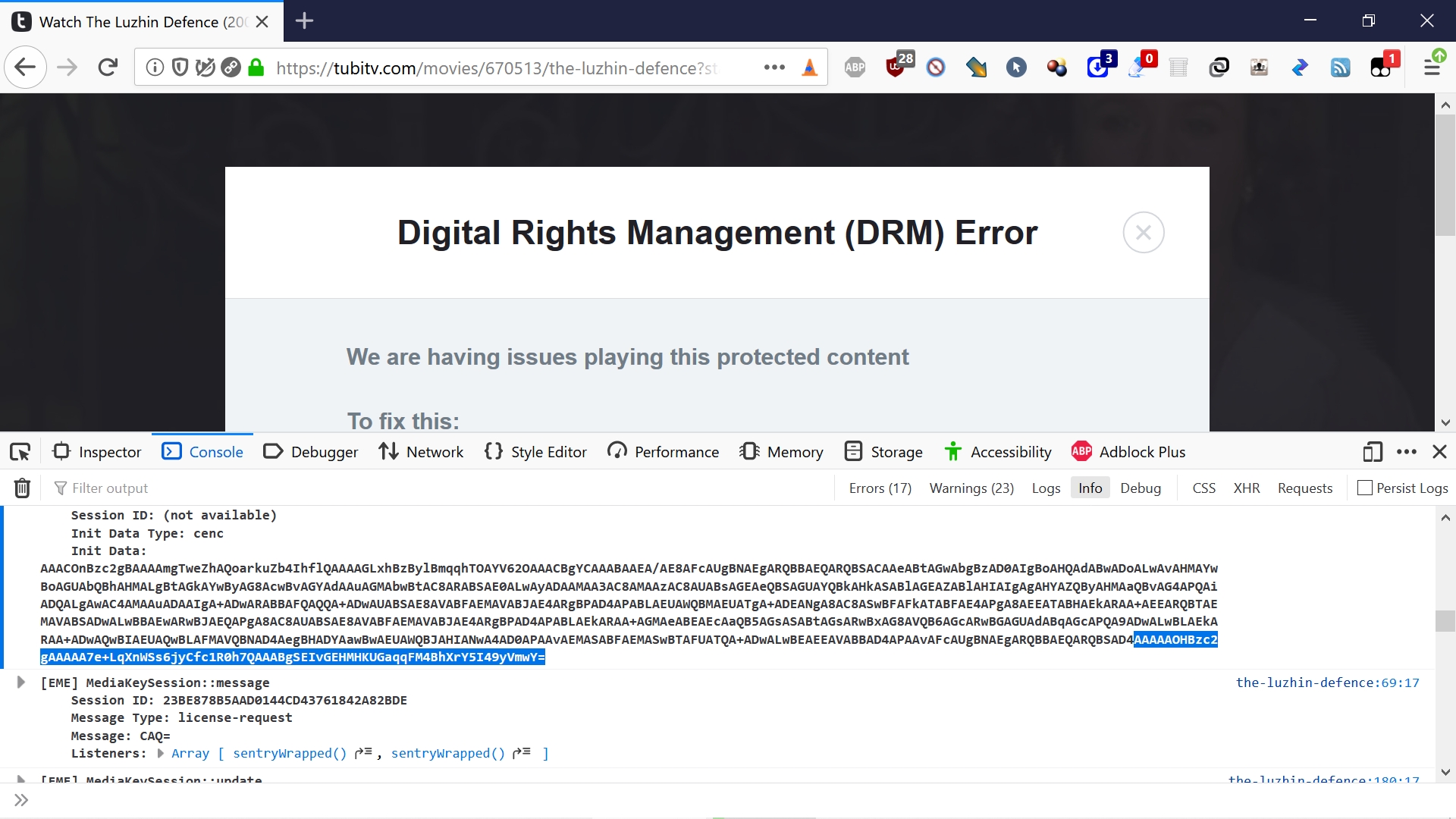 BTW, after installing Greasemonkey, the EME logger and Network Monitor, I started getting DRM Error on the page, the movie plays for a bit, but then it stops. It doesn't matter, the page generates what it's supposed to generate. So I grab the Console reader content from EME Logger.