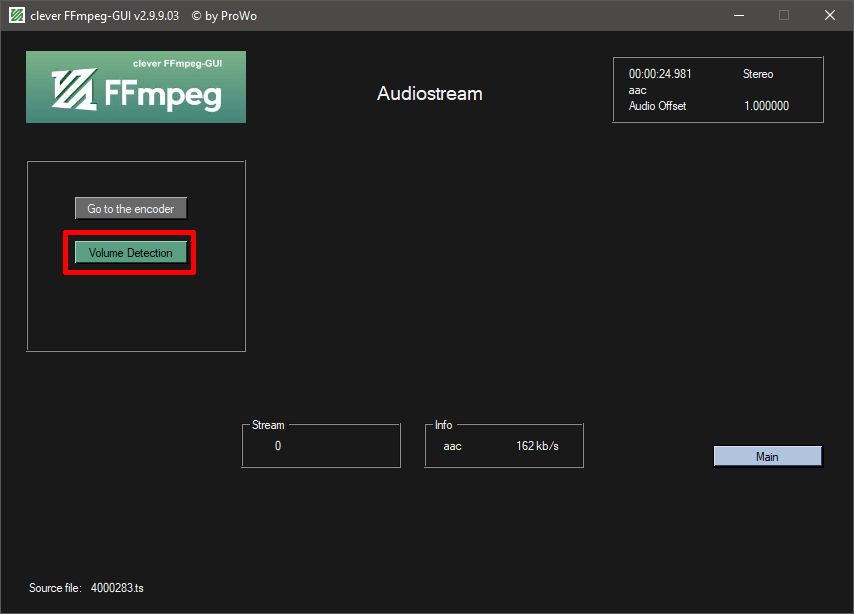 Load your mp4, wait until analysis is done, click main, click convert Audio Stream, click volume detection