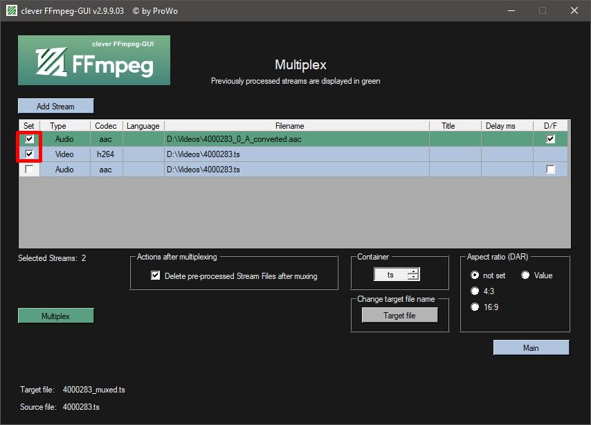 The new created audio stream (with increased volume) is shown in green. Deselect the original audiostream (in blue) and click multiplex.