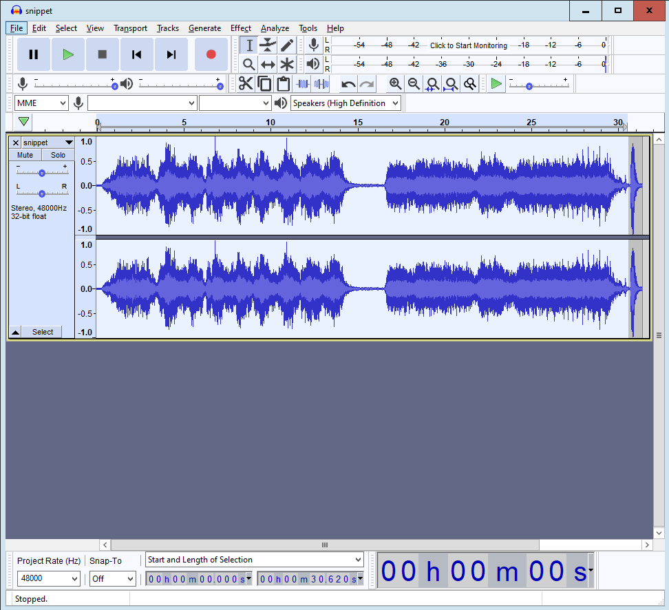 Here's an example. The track has a very loud section at the very end. If you use Amplify to increase the volume of the entire track: