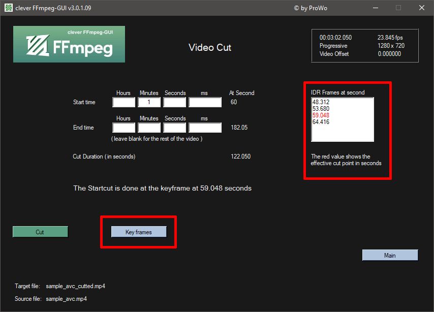 Load your file, click main, click cut, insert your desired start point and click Key Frames.