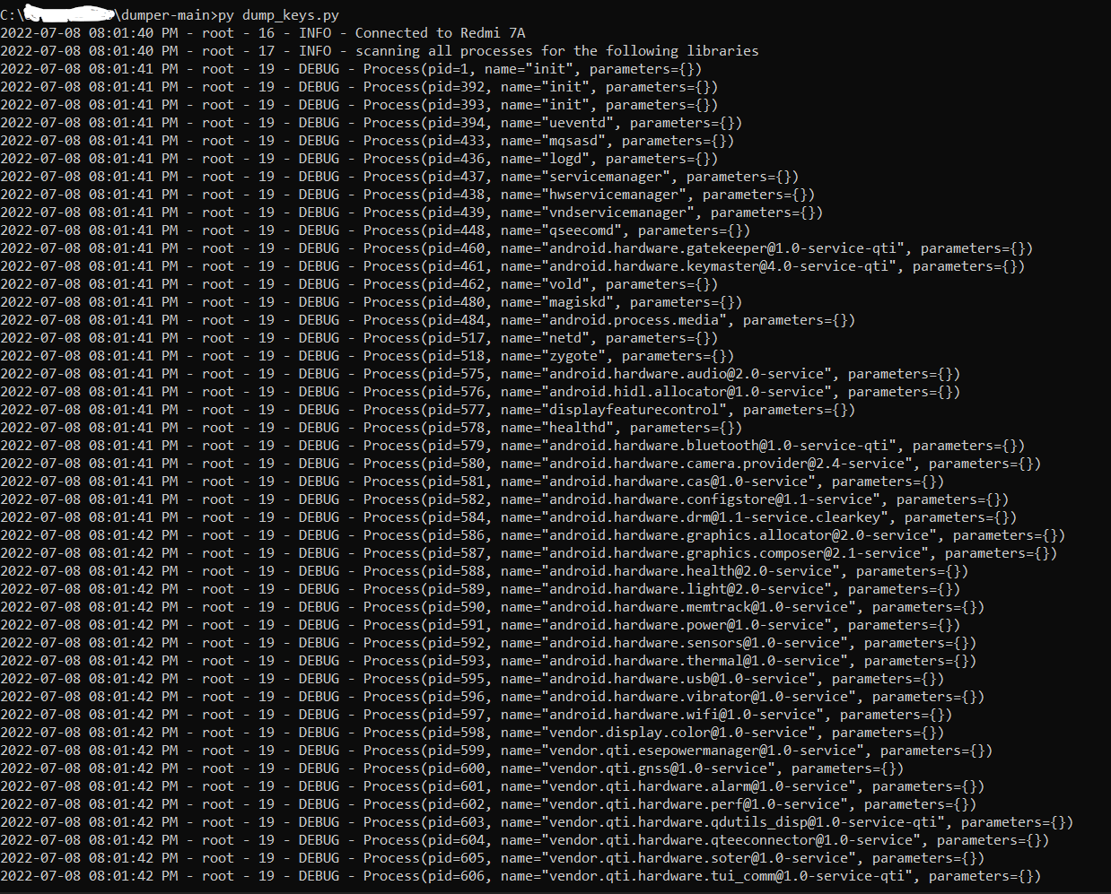 2022-07-08 07:17:43 PM - root - 19 - DEBUG - Process(pid=460, name="android.hardware.gatekeeper@1.0-service-qti", parameters={})