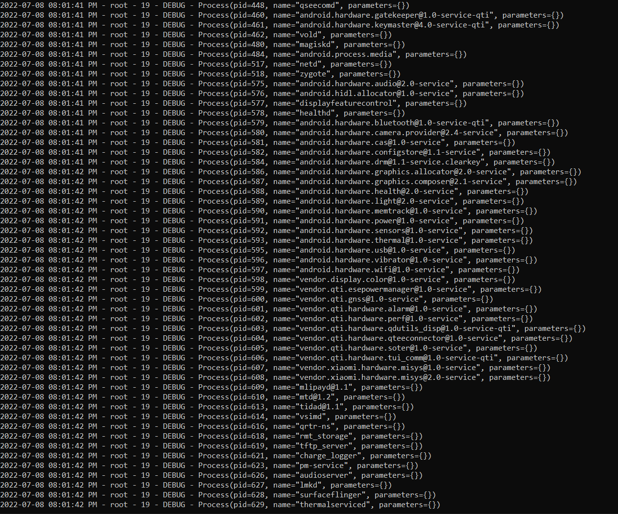 2022-07-08 07:17:43 PM - root - 19 - DEBUG - Process(pid=448, name="qseecomd", parameters={})