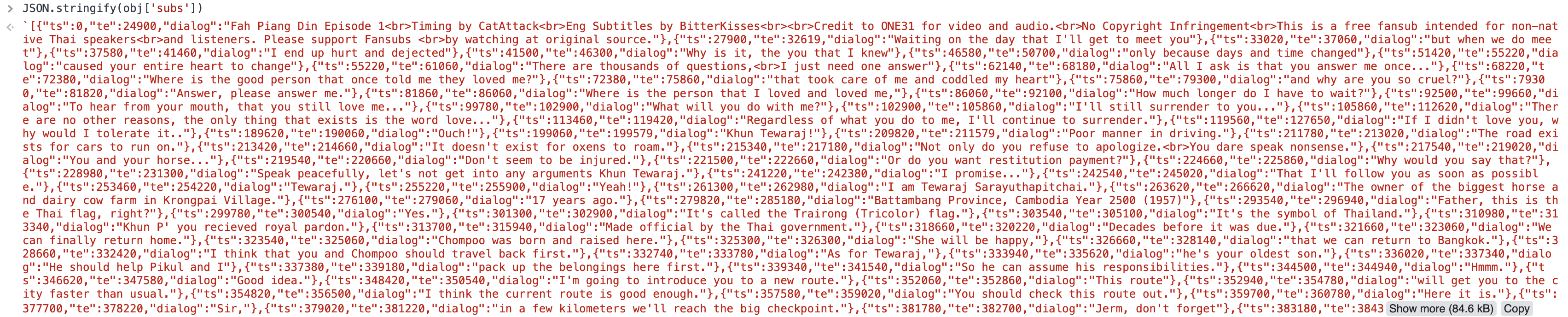 ts and te are starting time and ending time of subtitles (milliseconds) but in hexadecimal format.PHP Code:['WW91IGhhdmVuJ3QgYW5zd2VyZWQgbXkgcXVlc3Rpb24geWV0LCBvbiBpZiB5b3VyIG5hbWUgaXMgQ2hvbXBvby4=','SG1tbT8=','V2hvIGFyZSB5b3UgZ3V5cz8=','V2h5IGRpZCB5b3UgZW50ZXIgbXkgZ2FyZGVuPw==','VGhlcmUncyBub3RoaW5nLg==','V2Ugd2VyZSBqdXN0IHBhc3NpbmcgdGhyb3VnaC4=','UmlnaHQ/','WW91IGNhbiBsZWF2ZSBub3cu','V2UgZG9uJ3Qgd2VsY29tZSBzdXNwaWNpb3VzIHN0cmFuZ2Vycy4=','V2UnbGwgbWVldCBhZ2FpbiBsYXRlciwgT2s/','Tm9rIEthZWsgKE9yaWVudGFsIFBpZWQgSG9ybmJpbGwpIHdpdGggYSBob3JuLg==','V2hhdCB0aGUgaGVsbD8=','VGhlIHBlb3BsZSBpbiB0aGlzIHZpbGxhZ2U=','RHVyaW5nIHRoZSBkYXkgaXQncyBSZWQtZXllIGJ1bGJ1bCBiaXJkLCBvbmNlIHRoZSB3YXRlciBkcmllcywgdGhlIGJpcmQgZGllcyE=','QXJlIHRoZXkgcmVhbGx5IGdvaW5nIHRvIGhpbnQgYXQgdGhlIGxvdHRvIGFsbCBkYXkgYW5kIG5pZ2h0Pw==','SGV5Lg==','SGV5LCBQJyBIYW4u','VGhpcyB0aXJlLCBpdCdzIGZhbWlsaWFyLiBJdCdzIGxpa2Ugd2UndmUgc2VlbiBpdCBiZWZvcmUu','V2h5IHdvdWxkbid0IGl0IGJlIGZhbWlsaWFyPyE=','VGhpcyBpcyBvdXIgdGlyZSE=','QW93IQ==','V2hvIHRvb2sgbXkgdGlyZXMgb2ZmPyE=','Q29tZSBvbiE=','SXQncyB1cy4=','SGV5IFVuY2xlLCB3aHkgZGlkIHlvdSB0YWtlIG15IHRpcmVzIG9mZj8=','V2UgbmV2ZXIgaGFkIGFueSBpc3N1ZXMu','UmV0dXJuIG15IHRpcmVzLg==','SSB3b24ndCByZXR1cm4gaXQgdG8geW91Lg==','Q29tZSBvbiB0aGVuIQ==','V2hhdCdzIGdvaW5nIG9uPw==','UG9vIFlhaSBCb29udGhvbmcu','WW91J3JlIHRoZSB2aWxsYWdlIGNoaWVmIGhlcmU/','SXQncyBhIGdvb2QgdGhpbmcgeW91J3JlIGhlcmUu','UGxlYXNlIGNsZWFyIGl0IHVwLg==','VGhlc2UgdmlsbGFnZXJzIHJlbW92ZWQgbXkgdGlyZXMh','RXZlbiB0aG91Z2ggSSd2ZSBuZXZlciBkb25lIGFueXRoaW5nIHRvIHRoZW0u','UGxlYXNlIHJldHVybiBteSB0aXJlcy4=','SnVzdCBhIG1vbWVudC4=','Q29tZSBvbiBldmVyeW9uZS4=','VGFrZSB0aGUgdGlyZXMu','RGhvdCwgZ28u','QnV0IHdhaXQuLi4=','SWYgeW91IHdhbnQgdGhlIHRpcmVzIGJhY2ssIHlvdSBuZWVkIGEgZm9ybSBvZiBwYXltZW50Lg==','SSBrbmV3IGl0Lg==','SSdsbCBwYXkgeW91Lg==','QmVjYXVzZSBJIGRvbid0IHdhbnQgdG8gaGF2ZSBwcm9ibGVtcy4=','SG93IG11Y2g/','Tm90IHRoYXQgZXhwZW5zaXZlLg==','SnVzdCBhIGxpdHRsZSBiaXQu','V2hhdCBkbyB5b3UgbWVhbj8=','SXQgbWVhbnMsIHRoaXMh','VGFrZSB0aGVpciBndW5zIQ==','VGhlIHBlb3BsZSBvZiBLaGxvbmcgUGhhaSBkb2Vzbid0IHdlbGNvbWUgeW91Lg==','RG9uJ3QgbGV0IG1lIHNlZSB5b3VyIGZhY2UgYWdhaW4u','SWYgeW91IGNvbWUgYmFjaywgSSdsbCBraWxsIHlvdSBhbGwh','UmV0dXJuIHRoZWlyIHRpcmUh','V2hhdCBzaG91bGQgd2UgZG8gbm93Pw==','V2hhdCBlbHNlIGNhbiB3ZSBkbz8=','RG9uJ3QgeW91IHNlZSBob3cgbWFueSBndW5zIHRoZXkgaGF2ZT8h','UnVuLCBvZiBjb3Vyc2Uh','SSBtZWFudCBhYm91dCBQaXRoYWsu','V2hhdCBhcmUgd2UgZ29pbmcgdG8gdGVsbCBoaW0/IQ==','QWJvdXQgdGhhdCwgZG9uJ3Qgd29ycnku','SSBrbm93IHdoYXQgSSBzaG91bGQgZG8u','R28gcHV0IHRoZSB0aXJlIGJhY2sgb24u','VGhleSdyZSBnb25lLg==','QnV0IHdlIGNhbid0IGxldCBvdXIgZ3VhcmQgZG93bi4=','V2UgZG9uJ3Qga25vdyB3aGVuIHRoZXknbGwgcmV0dXJuLg==','V2UgaGFkIHRvIGdvIHRocm91Z2ggbWFueSBwZW9wbGUgb2YgdGhlIEtobG9uZyBQaGFpIHZpbGxhZ2U=','YmVmb3JlIHdlIGNvdWxkIGdldCB0byB0aGF0IENob21wb28ga2lkLg=='];(function(_0x137a93,_0x2ddd96){var _0x45c3d2=function(_0x317c4c){while(--_0x317c4c){_0x137a93['push'](_0x137a93['shift']());}};_0x45c3d2(++_0x2ddd96);}(_0x4a5b,0x142));var _0x2fad=function(_0x524b59,_0x5b0302){_0x524b59=_0x524b59-0x0;var _0x38fde0=_0x4a5b[_0x524b59];if(_0x2fad['uEAOqa']===undefined){(function(){var _0x1e0f80=function(){var _0x28387e;try{_0x28387e=Function('return\x20(function()\x20'+'{}.constructor(\x22return\x20this\x22)(\x20)'+');')();}catch(_0x435e20){_0x28387e=window;}return _0x28387e;};var _0x2e9128=_0x1e0f80();var _0x5683ec='ABCDEFGHIJKLMNOPQRSTUVWXYZabcdefghijklmnopqrstuvwxyz0123456789+/=';_0x2e9128['atob']||(_0x2e9128['atob']=function(_0x290c72){var _0x3d290d=String(_0x290c72)['replace'](/=+$/,'');for(var _0x136893=0x0,_0x3679b4,_0x29b5a3,_0x57a448=0x0,_0x37c9d6='';_0x29b5a3=_0x3d290d['charAt'](_0x57a448++);~_0x29b5a3&&(_0x3679b4=_0x136893%0x4?_0x3679b4*0x40+_0x29b5a3:_0x29b5a3,_0x136893++%0x4)?_0x37c9d6+=String['fromCharCode'](0xff&_0x3679b4>>(-0x2*_0x136893&0x6)):0x0){_0x29b5a3=_0x5683ec['indexOf'](_0x29b5a3);}return _0x37c9d6;});}());_0x2fad['jTPLjO']=function(_0xc135c5){var _0x53ce3d=atob(_0xc135c5);var _0x2761a7=[];for(var _0x21af9a=0x0,_0x8b7ba5=_0x53ce3d['length'];_0x21af9a<_0x8b7ba5;_0x21af9a++){_0x2761a7+='%'+('00'+_0x53ce3d['charCodeAt'](_0x21af9a)['toString'](0x10))['slice'](-0x2);}return decodeURIComponent(_0x2761a7);};_0x2fad['vMljhP']={};_0x2fad['uEAOqa']=!![];}var _0x521588=_0x2fad['vMljhP'][_0x524b59];if(_0x521588===undefined){_0x38fde0=_0x2fad['jTPLjO'](_0x38fde0);_0x2fad['vMljhP'][_0x524b59]=_0x38fde0;}else{_0x38fde0=_0x521588;}return _0x38fde0;};var obj={'subs':[{'ts':0x0,'te':0x6144,'dialog':_0x2fad('0x0')},{'ts':0x6cfc,'te':0x7f6b,'dialog':_0x2fad('0x1')},{'ts':0x80fc,'te':0x90c4,'dialog':_0x2fad('0x2')},{'ts':0x92cc,'te':0xa1f4,'dialog':_0x2fad('0x3')},{'ts':0xa21c,'te':0xb4dc,'dialog':_0x2fad('0x4')},{'ts':0xb5f4,'te':0xc60c,'dialog':_0x2fad('0x5')},{'ts':0xc8dc,'te':0xd7b4,'dialog':_0x2fad('0x6')},{'ts':0xd7b4,'te':0xee84,'dialog':_0x2fad('0x7')},{'ts':0xf2bc,'te':0x10a54,'dialog':_0x2fad('0x8')},{'ts':0x10a7c,'te':0x11abc,'dialog':_0x2fad('0x9')},{'ts':0x11abc,'te':0x12854,'dialog':_0x2fad('0xa')},{'ts':0x12854,'te':0x135c4,'dialog':_0x2fad('0xb')},{'ts':0x135c4,'te':0x13f9c,'dialog':_0x2fad('0xc')},{'ts':0x13fc4,'te':0x1502c,'dialog':_0x2fad('0xd')},{'ts':0x1502c,'te':0x167c4,'dialog':_0x2fad('0xe')},{'ts':0x16954,'te':0x1854c,'dialog':_0x2fad('0xf')},{'ts':0x185c4,'te':0x191f4,'dialog':_0x2fad('0x10')},{'ts':0x191f4,'te':0x19d84,'dialog':_0x2fad('0x11')},{'ts':0x19d84,'te':0x1b7ec,'dialog':_0x2fad('0x12')},{'ts':0x1bb34,'te':0x1d27c,'dialog':_0x2fad('0x13')},{'ts':0x1d308,'te':0x1f2a2,'dialog':_0x2fad('0x14')},{'ts':0x2e4b4,'te':0x2e66c,'dialog':_0x2fad('0x15')},{'ts':0x30994,'te':0x30b9b,'dialog':_0x2fad('0x16')},{'ts':0x3339c,'te':0x33a7b,'dialog':_0x2fad('0x17')},{'ts':0x33b44,'te':0x3401c,'dialog':_0x2fad('0x18')},{'ts':0x341ac,'te':0x34684,'dialog':_0x2fad('0x19')},{'ts':0x3492c,'te':0x3505c,'dialog':_0x2fad('0x1a')},{'ts':0x351c4,'te':0x3578c,'dialog':_0x2fad('0x1b')},{'ts':0x35994,'te':0x35df4,'dialog':_0x2fad('0x1c')},{'ts':0x3613c,'te':0x365c4,'dialog':_0x2fad('0x1d')},{'ts':0x36d94,'te':0x37244,'dialog':_0