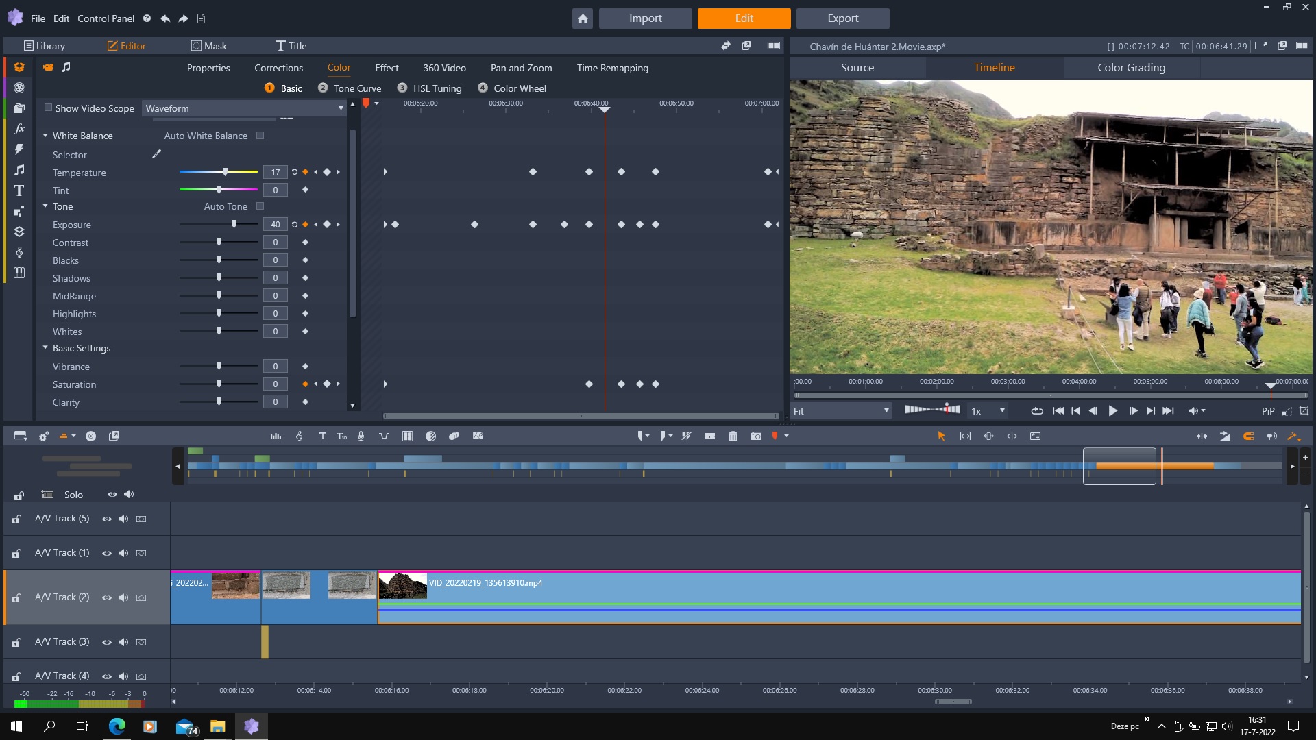 At some points the video gets almost dark and colors dissapear. I would like to try to compensate this to get some more usable images. But I'm quite struggeling with it. The video is quite dynamic, because I'm turning around. When turning over the square, colors and brightness is normal again. So I can't put some effects over the whole clip, but I need to use some keyframes. Sliding "exposure" up at some intervals makes a difference. But still colors look realy bad at some points.