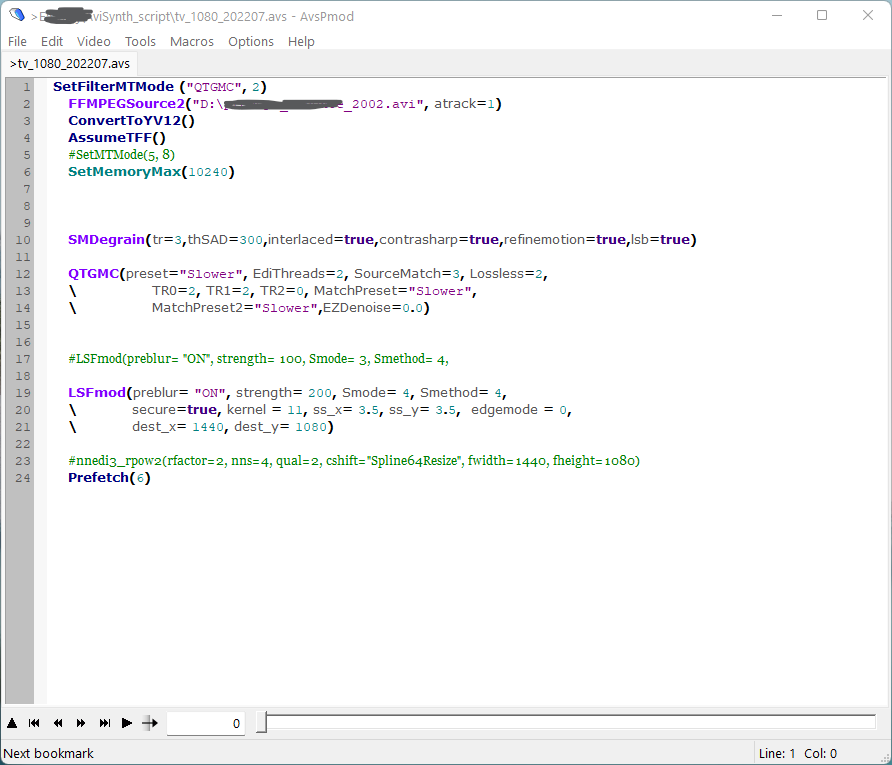 The script is the one shown below. It takes a 37-minute sample YUY2 clip captured from a VHS, which gets some denoising, sharpening, QTGMC deinterlacing and 1080p upscaling.