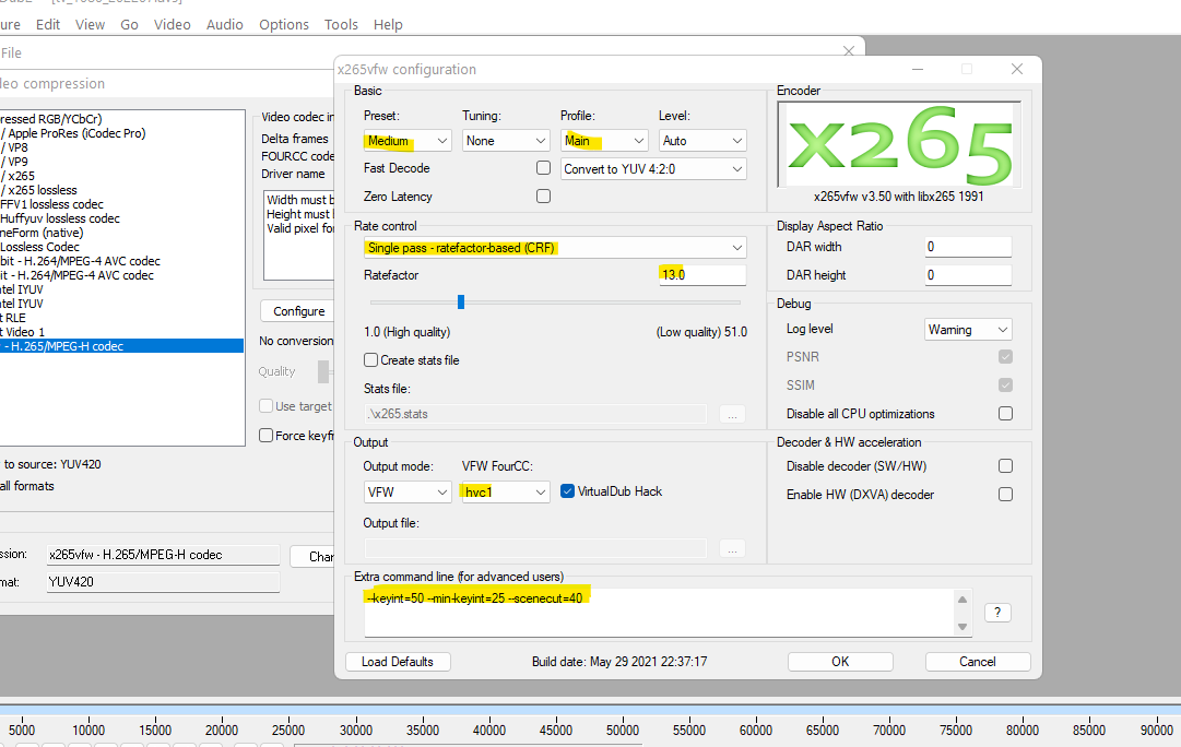 I've then dragged the script into VirtualDub2 to encode it to x265 with the following settings: