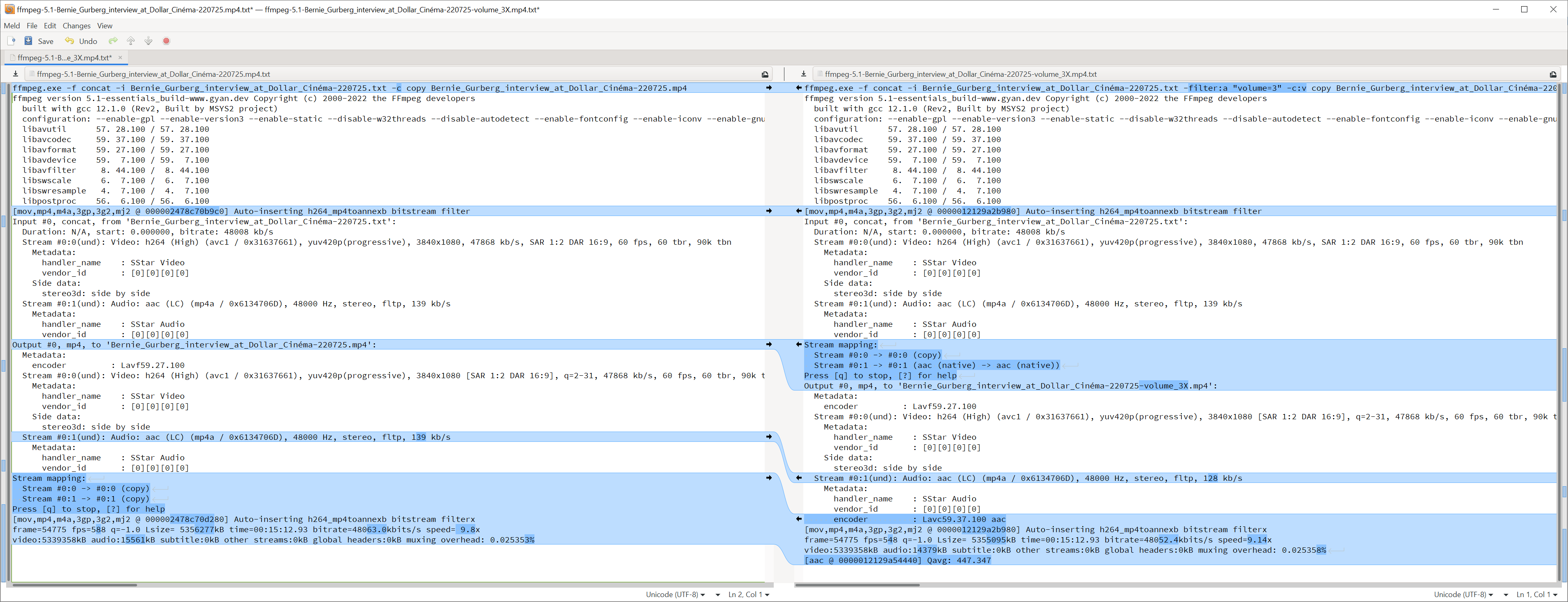 However when I created this thread I didn't have in mind that I was watching the originals with the player software volume at 200%. So I need to do the increase the audio accordingly as many users wouldn't be able to properly hear the video on Youtube and the like. I then triedbut the process was much quicker and displayed in redffmpeg.exe -f concat -i Bernie_Gurberg_interview_at_Dollar_Cinéma-220725.txt -filter:a "volume=2" -c copy Bernie_Gurberg_interview_at_Dollar_Cinéma-220725-volume_2X.mp4