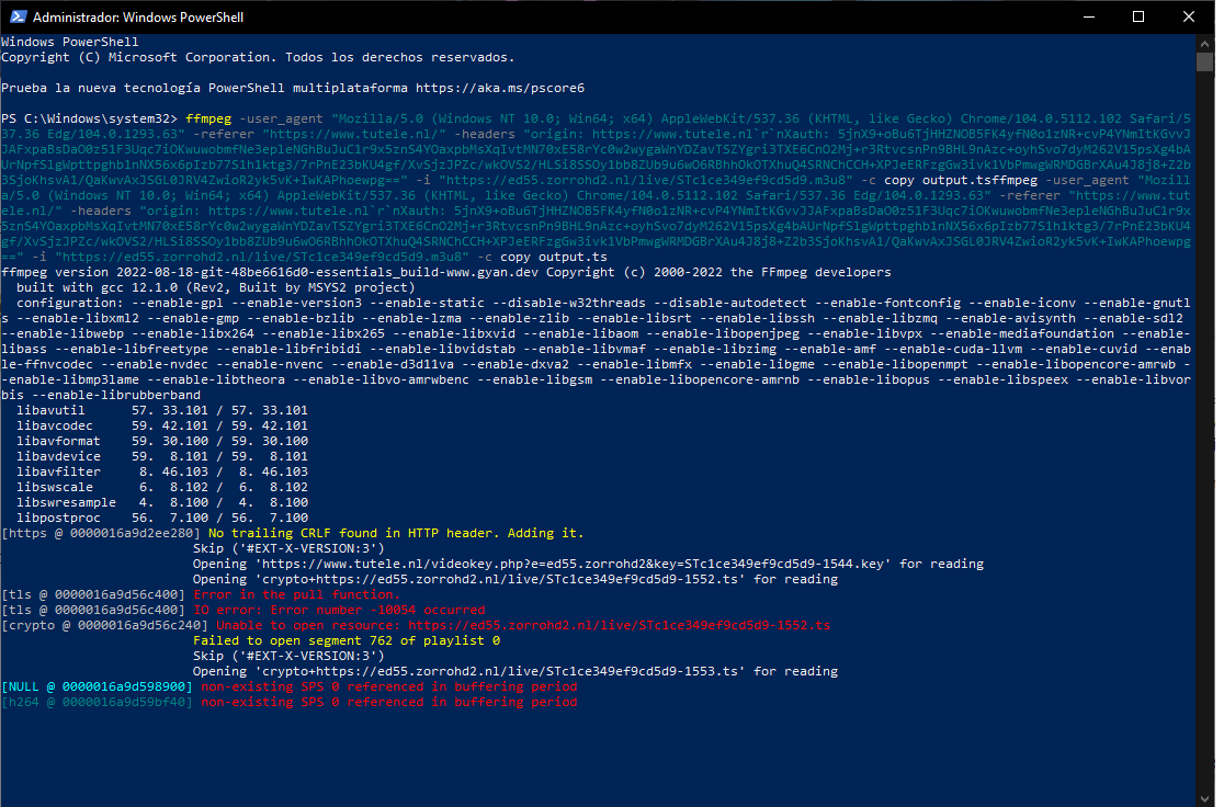 Code:ffmpeg -user_agent "Mozilla/5.0 (Windows NT 10.0; Win64; x64) AppleWebKit/537.36 (KHTML, like Gecko) Chrome/104.0.5112.102 Safari/537.36" -referer "https://www.tutele.nl/" -headers "origin: https://www.tutele.nl`r`nXauth: 5jnX9+oBu6TjHHZNOB5FK4yfN0o1zNR+cvP4YNmItKGvvJJAFxpaBsDaO0z51F3Uqc7iOKwuwobmfNe3epleNGhBuJuC1r9x5znS4YOaxpZRQJ8Ft/DTudfh2xatL8ziVMowRuhGWA8EXMGv83eGvbJgyQiDCnpKyy5DUWnHb8Ev1l8ycZNROatzwj4CmEq5voO35ZFRrYqavv7LWzrwTHgnzTcqT+U/1RLVOJUFJvpl1bEcSItC2yZL4W03r4y4eafq+Rx+TFIgsBuKWucoaeXIx7OpOLqVVcuAKbZM2/FSqsm4kVbiH3C0a+dtEUzeZDXwZc+nPLCA8PWlOSACk93WCQnZ3g8m3rCWAHYBsTP0Do5/yfrciojHVO0mtVGL" -i "https://ed55.zorrohd2.nl/live/STc1ce349ef9cd5d9.m3u8" -c copy output.ts