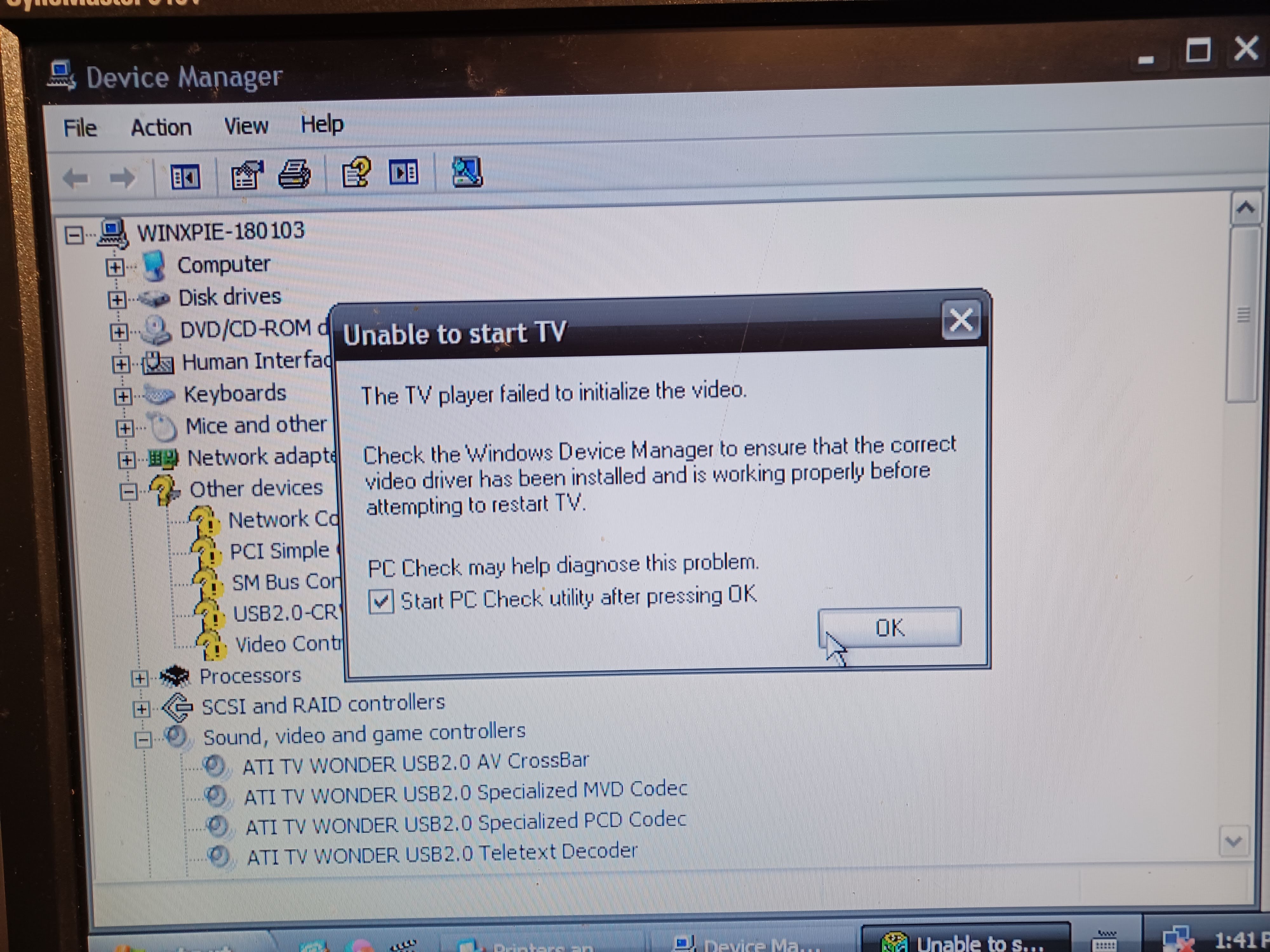 I installed the drivers for the ATI TV Wonder USB2.0 device (gray and red device) a few months ago, and the ATI multimedia center. I was able to launch the ATI capture app. But when I tried today, the error message said: "Unable to start TV. The TV player failed to initialize the video. Check the Windows Device Manager to ensure that the correct video driver has been installed and is working properly before attempting to restart TV."