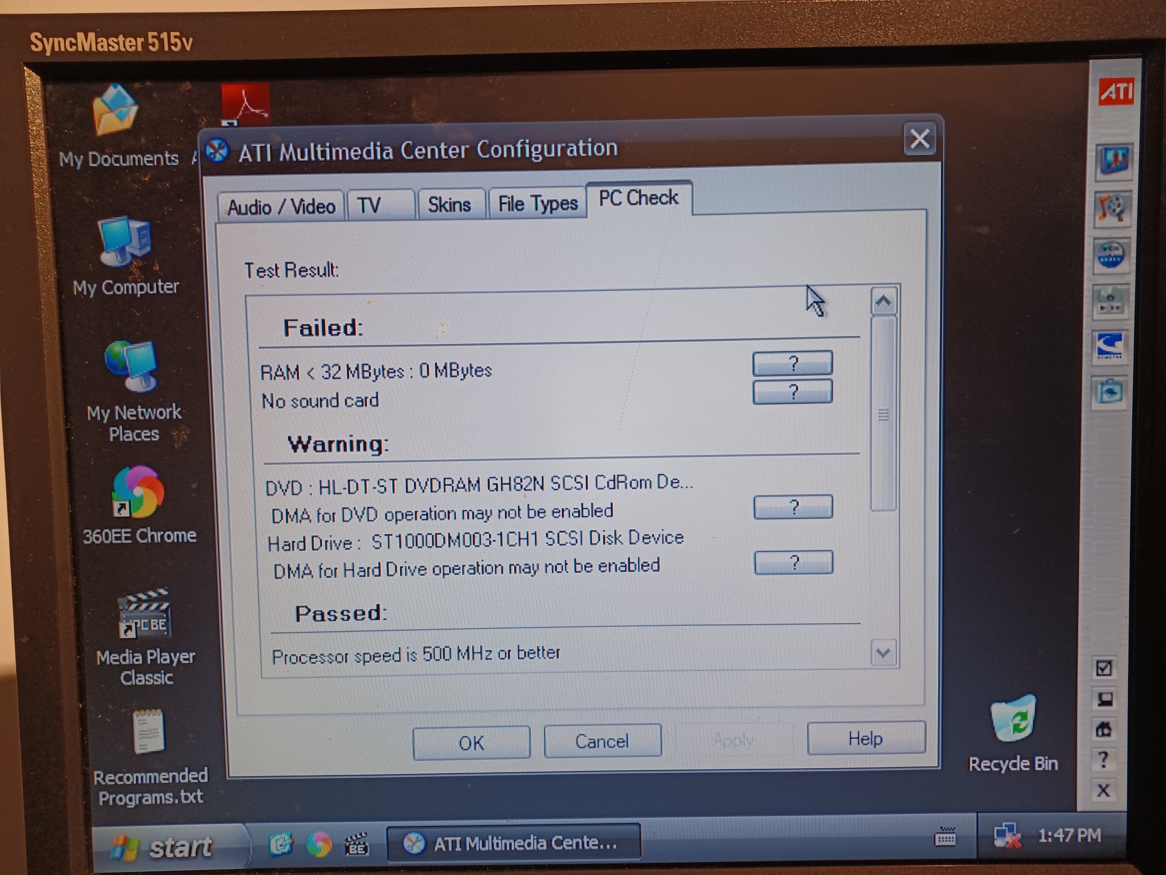 I ran the PC Check diagnostic. It identified these issues: "No sound card. RAM < 32 Mbytes : 0 MBytes." That is odd because I have 4 GB or RAM.