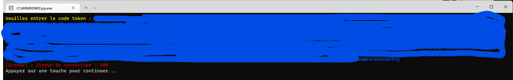 Can you help me get the license code? thank you in advanceCode:import requests import json import os BLUE = '\x1b[38;5;27m' YELLOW = '\x1b[38;5;226m' RED = '\x1b[38;5;160m' END = '\x1b[0;0m' print(f'{YELLOW}Veuillez entrer le code token : {END}{BLUE}', end='') token = input() response = requests.post('https://lic.drmtoday.com/license-proxy-widevine/cenc/?specConform=true', headers={'User-Agent': 'Mozilla/5.0 (Windows NT 10.0; Win64; x64; rv:105.0) Gecko/20100101 Firefox/105.0', 'x-dt-auth-token': '{0}'.format(token)}) if response.status_code == 200: print(f"License Response:\n{response.text}") output_json = json.loads(response.text) print(f"{output_json['license']}") os.system("pause") else: print(f'{RED}[Erreur] : Erreur de connection : {response.status_code}{END}') os.system("pause")
