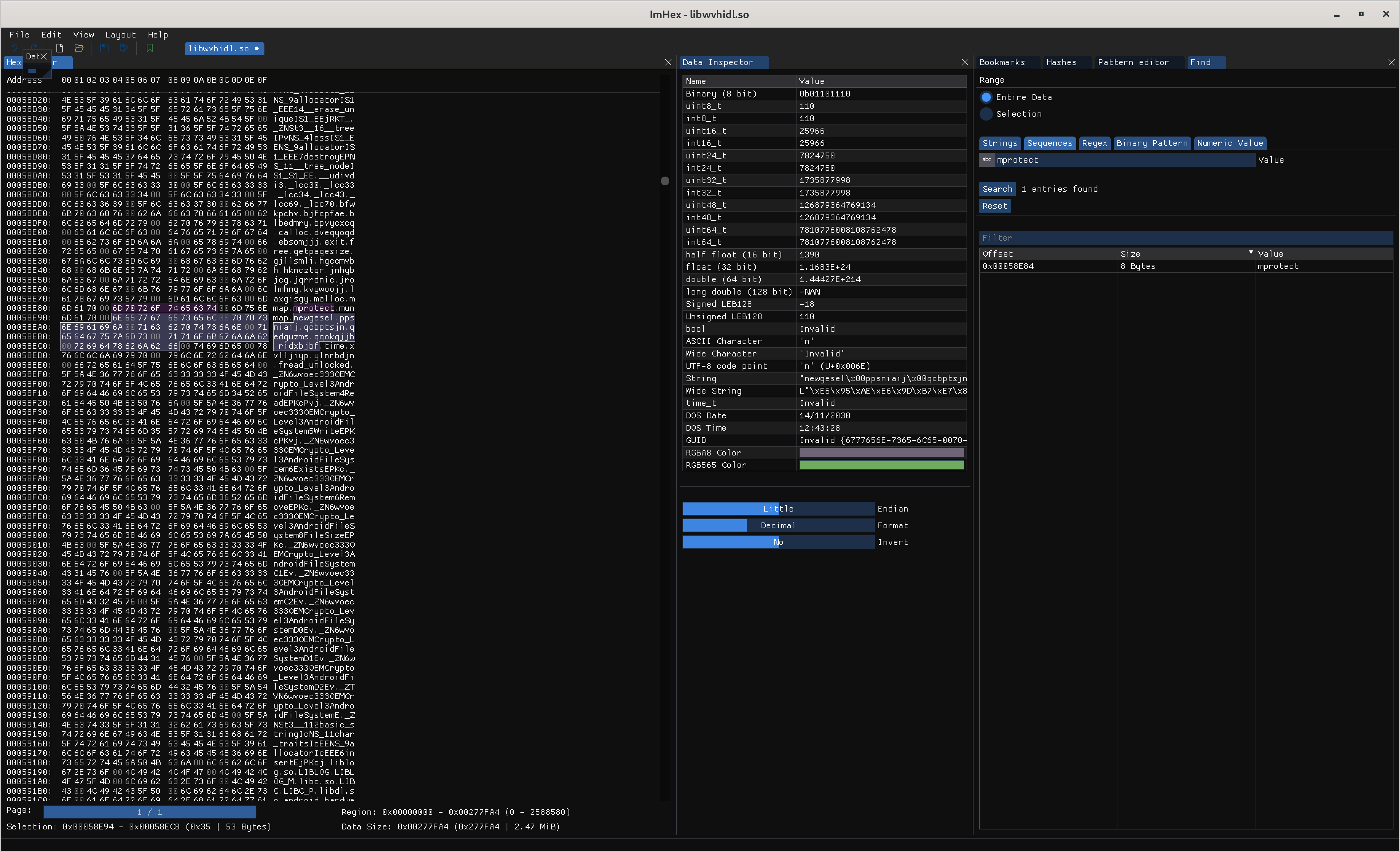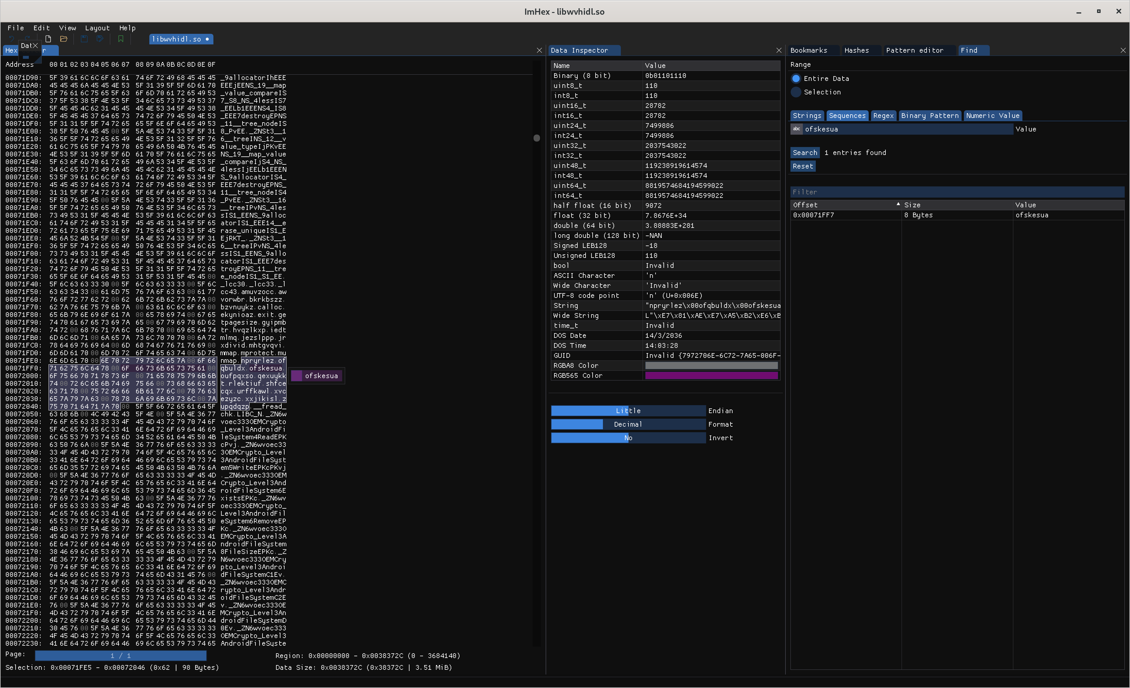 So now I have an original libwvhidl.so file and I know the function-name is ofskesua. Time to breakout a hex-editor. I hate these things; the last time I tangled was to remove DRM from an Aviation GPSs data-update 20 years ago before the manufacturer got serious.