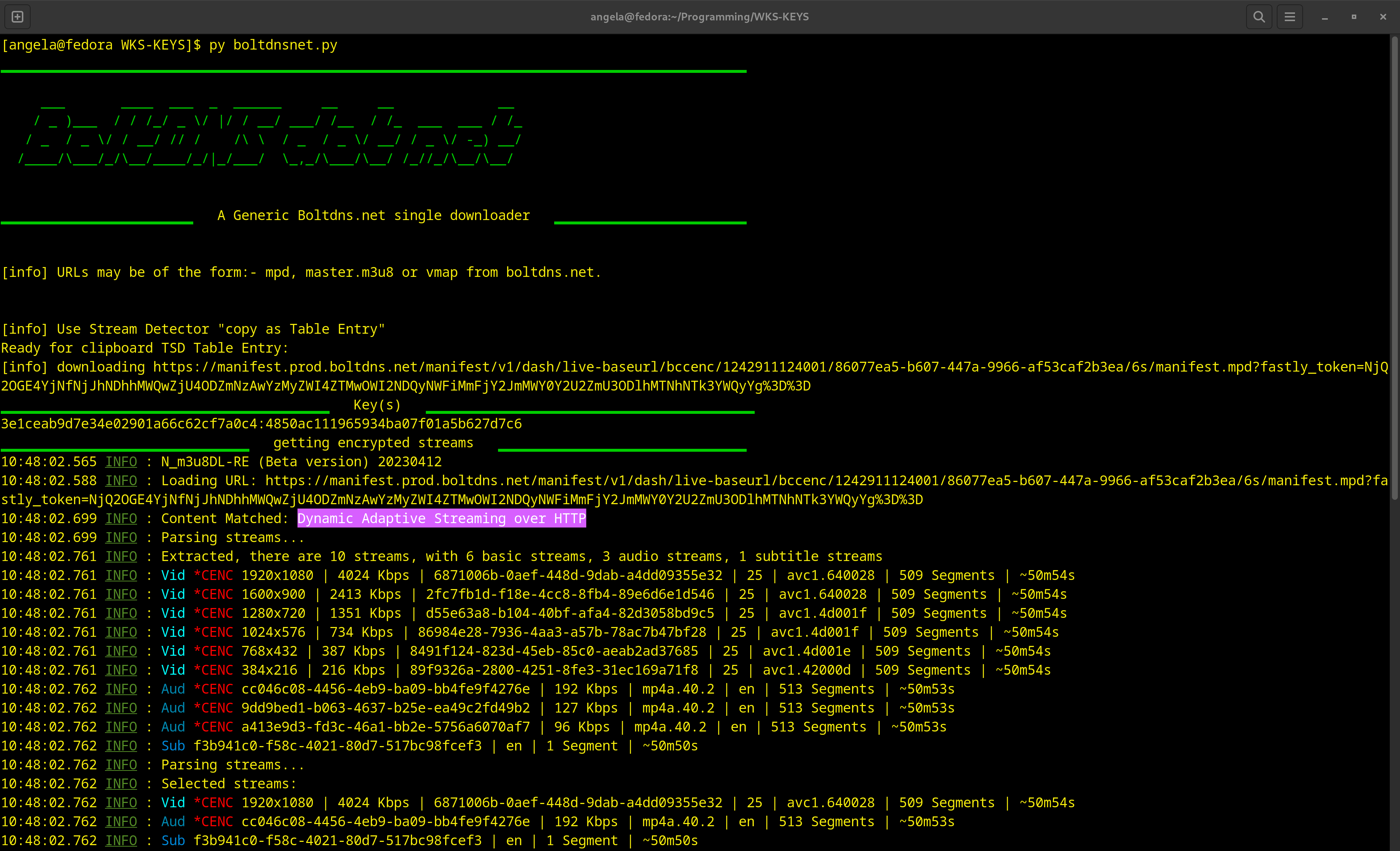 I used the python script here for the boltsdns.net generic one for my site, which has mpd, drm protected with dash. It gives the key however it is not going forward with the download due to an error.