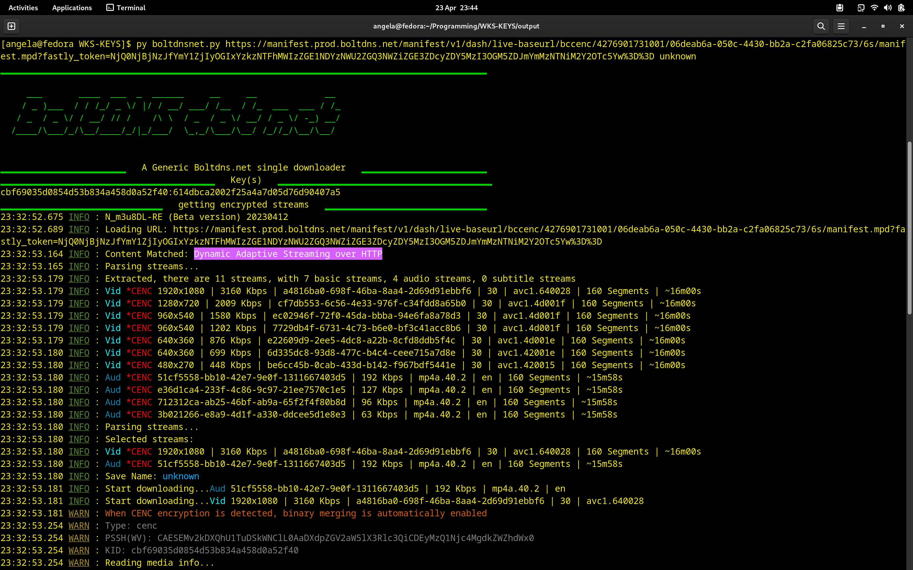 Code:#!/usr/bin/env python3 # # v 2.0 # # A_n_g_e_l_a 03:02:2023 # ''' This program is a generic boltdns.net downloader. It takes only a SINGLE mpd url, master.m3u8 or vmap - as input as a 'media_url' within 'Table Entry from The Stream Detector The program downloads, decodes and merges. Written for Linux systems using WKS-KEYS with a working CDM. For encrypted media, this program needs to be in WKS-KEYS folder to use your local CDM it will save to ./output/ from the WKS_KEYS folder and you need create the folder 'output' if it doesn't exist. N_m3u8DL-RE, shaka-packager, mkvmerge and ffmpeg need to be in Path. (Windows users may need to tack .exe on the end of the called programs in the code below) #not used currently #'pip install vtt_to_srt3' probably needed first; installs a subtitle conversion that works better than N_m3u8DL-RE's 'The Stream Detector' browser plugin (Chrome + Firefox) is required. Find here: Firefox version - https://addons.mozilla.org/en-US/firefox/addon/hls-stream-detector/ Chrome version: https://github.com/rowrawer/stream-detector/releases choose hls_stream_detector-2.1X.XX.crx and in chrome://extensions/ set Developer mode (top-right window) and drag and drop the crx file into the window to install Once installed configure with an additional filter set for 'vmap'. Under Options: 'Detect additional file extensions:' set checkbox ticked and enter 'vmap' in box. working for :- STV.tv both encrypted and encryption free uktvplay.co.uk all encrypted. tptvencore.co.uk mainly unencrypted m3u8 but some encrypted vmap included too. Media_url may need to be contained in single quotes if there are '&' characters present. tg4.ie all encrypted and possibly other providers using boltdns.net for streaming The program is configured to use alternate inputs on the command line of media url and videoname. So without the Stream Detector just call 'python boltdnsnet.py https://manifest.prod.boltdns.net/manifest/v1/dash/live-baseurl/bccenc/1242911124001/86077ea5-b607-447a-9966-af53caf2b3ea/6s/manifest.mpd?fastly_token=NjQ2OGE4YjNfNjJhNDhhMWQwZjU4ODZmNzAwYzMyZWI4ZTMwOWI2NDQyNWFiMmFjY2JmMWY0Y2U2ZmU3ODlhMTNhNTk3YWQyYg%3D%3D SmotherS01E06' ''' import requests from pywidevine.L3.cdm import deviceconfig from base64 import b64encode from pywidevine.L3.decrypt.wvdecryptcustom import WvDecrypt import re import subprocess import pyfiglet as PF from termcolor import colored import pyperclip as PC import os import math ## globals headers = { 'User-Agent': 'Dalvik/2.9.8 (Linux; U; Android 9.9.2; ALE-L94 Build/NJHGGF)', 'Accept': '*/*', 'Accept-Language': 'en-GB,en;q=0.9', 'Connection': 'keep-alive', } # defs # regex search for pssh and license url def get_pssh_lic(mpd_url): mpd = requests.get(mpd_url, headers).text lines = mpd.split("\n") for line in lines: m = re.search('<cenc:pssh>(AAAA.+?)</cenc:pssh>', line) n = re.search('bc:licenseAcquisitionUrl=\"(http.+?)\" xmlns:bc=\"urn:brightcove:2015\"', line) if m: pssh = m.group(1) if n: lic_url = n.group(1) return pssh, lic_url ## pretty print screen divisions def divides(text): #text = text l = len(text) count, lines = os.get_terminal_size() count = int(count) if count <= 78: count = int(count) else: count = int(math.ceil(count/2)) count = count - l if text != 'null': line = (chr(9601) * int(math.ceil(count/2))) #print("\n") print(colored(line, 'green'), " ", text, " ", colored(line, 'green')) else: line = (chr(9601) * int(count + 10)) print(colored(line, 'green')) # WKS-KEYS key fetch def WV_Function(pssh, lic_url, cert_b64=None): wvdecrypt = WvDecrypt(init_data_b64=pssh, cert_data_b64=cert_b64, device=deviceconfig.device_android_generic) widevine_license = requests.post(url=lic_url, data=wvdecrypt.get_challenge(), headers=None) license_b64 = b64encode(widevine_license.content) wvdecrypt.update_license(license_b64) Correct, keyswvdecrypt = wvdecrypt.start_process() if Correct: mykeys = '' for key in keyswvdecrypt: mykeys += key + '--key' if mykeys.endswith('--key'): mykeys = mykeys[:-5] divides('Key(s)') print(mykeys) return mykeys # find mpd/m3u8 in vmap def parse_vmap(content): lines = content.split("\n") for line in lines: m = re.search(r'contenturi="(https.+?)" contentlength=', line) if m: media_url = m.group(1) return(media_url) return None # add leading zero to series or episode def pad_number(match): number = int(match.group(1)) return format(number, "02d") if __name__ == '__main__': #### main #### divides("null") print() title = PF.figlet_format(' BoltDNS dot net ', font='smslant') print(colored(title, 'green')) divides('A Generic Boltdns.net single downloader') from sys import argv #print(argv) if argv and len(argv) > 1: media_url = argv[1] videoname = argv[2] else: print('\n\n[info] URLs may be of the form:- mpd, master.m3u8 or vmap from boltdns.net.') print('\n\n[info] Use Stream Detector "copy as Table Entry"') input("Ready for clipboard TSD Table Entry: ") line = PC.paste() if 'master.m3u8?behavior_id' in line: # keeps changing!! STV = True else: STV = False linetuple = line.split('|') media_url = linetuple[0].replace('\n','').replace(' ', '') print(f"[info] downloading {media_url}") # collect videoname from table entry # each site has different naming conventions # this may need tweeking ... if STV: videoname1 = linetuple[1] videoname2 = linetuple[2].split(',') videoname2 = videoname2[0] videoname = (videoname1 + videoname2).replace(' ','_').replace('__','-') else: videoname = linetuple[1].replace('\n','').replace(' ','_')\ .replace('_Watch_','').replace('_Online_','') if videoname.endswith('_'): videoname = videoname.rstrip(videoname[-1]) if videoname.startswith('_'): videoname = videoname[1:] if not STV: videoname = videoname.replace('Series_','S').replace('_Episode_','E')\ .replace("'", '').replace('(','').replace(')','').replace(':','.') videoname = re.sub(r"(\d+)", pad_number, videoname) # ... or reverting #videoname = input("Enter Video name to save: (without mkv) : ") #### decide type dash (mpd), m3u8 or vmap dash = "dash" #en