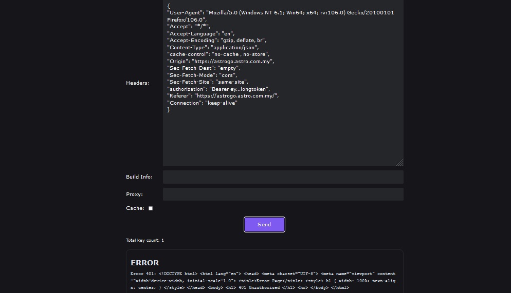 Code:{ "User-Agent": "Mozilla/5.0 (Windows NT 6.1; Win64; x64; rv:106.0) Gecko/20100101 Firefox/106.0", "Accept": "*/*", "Accept-Language": "en", "Accept-Encoding": "gzip, deflate, br", "Content-Type": "application/json", "cache-control": "no-cache , no-store", "Origin": "https://astrogo.astro.com.my", "Sec-Fetch-Dest": "empty", "Sec-Fetch-Mode": "cors", "Sec-Fetch-Site": "same-site", "authorization": "Bearer ey...longtoken", "Referer": "https://astrogo.astro.com.my/", "Connection": "keep-alive" } -