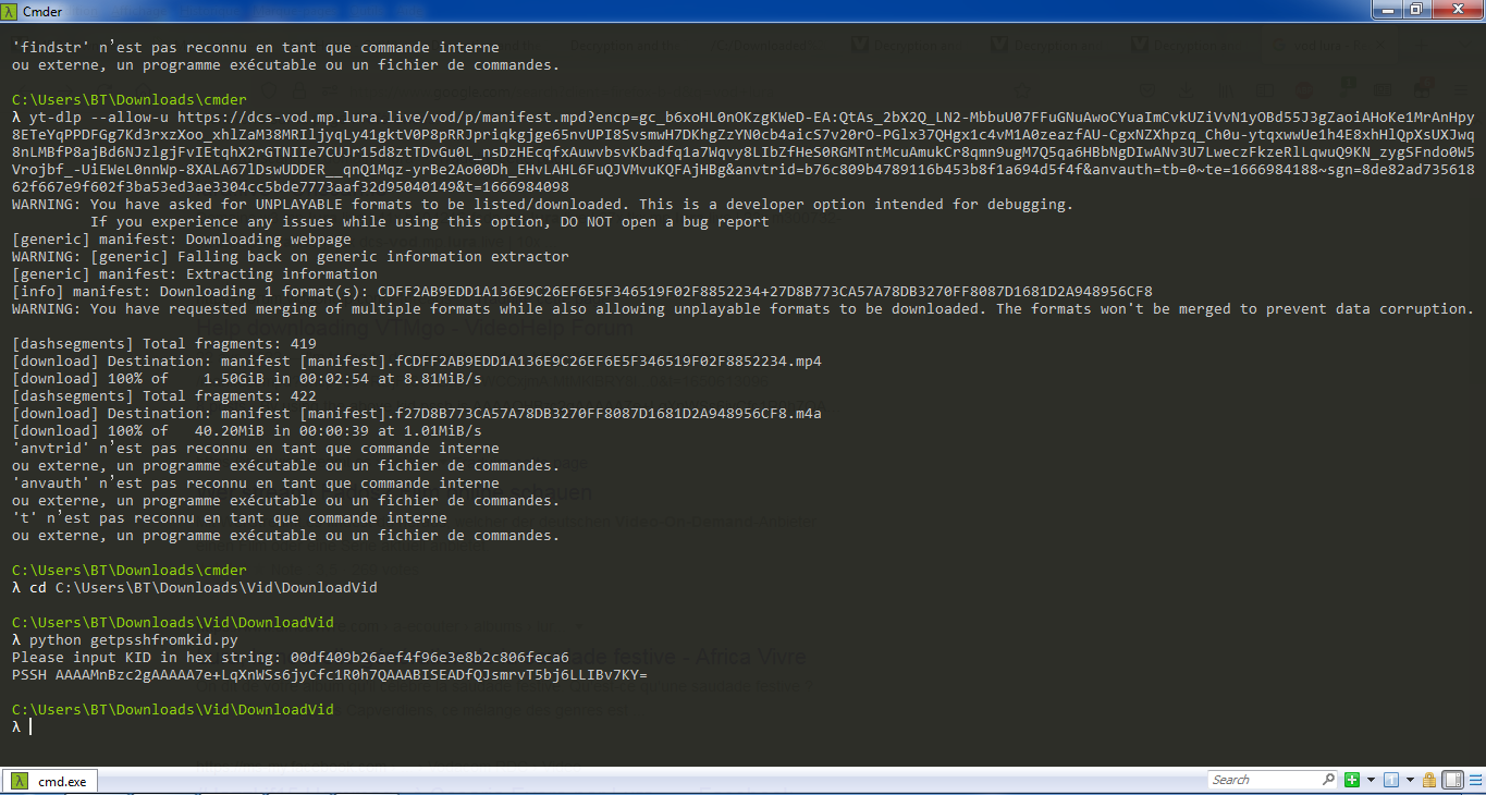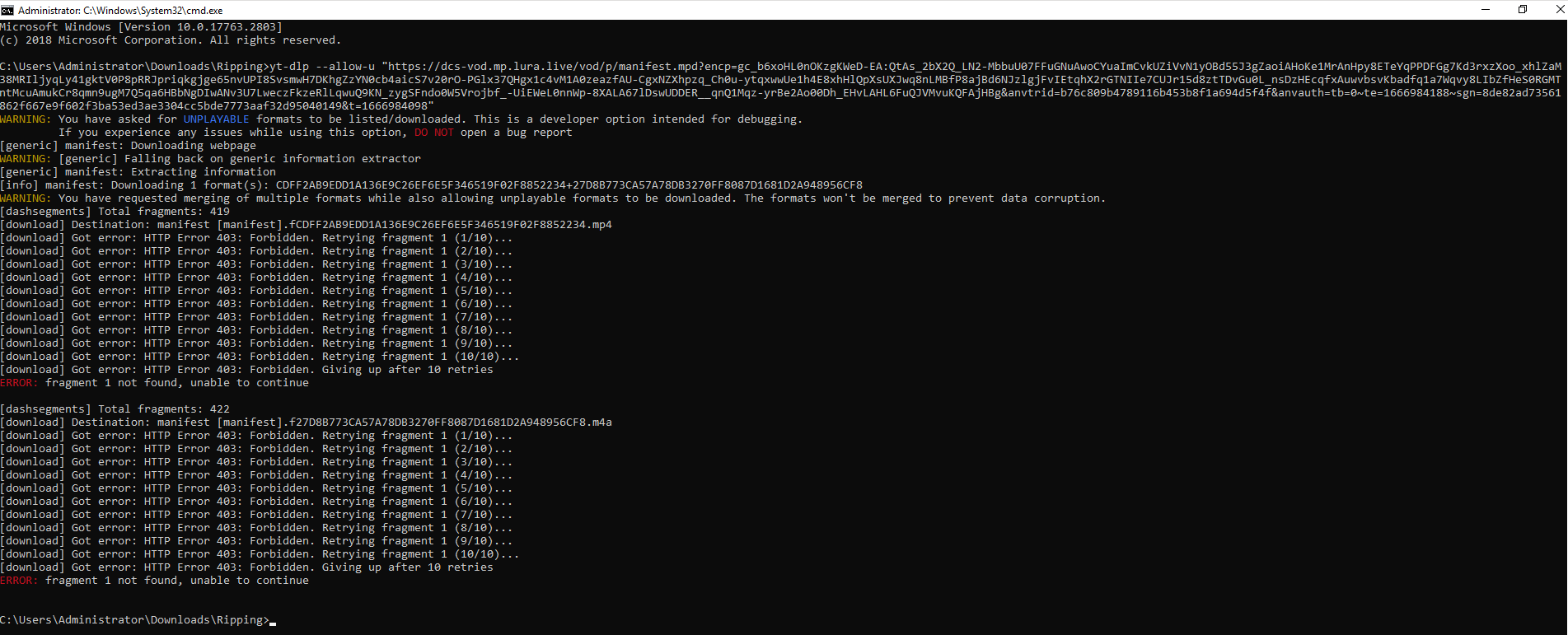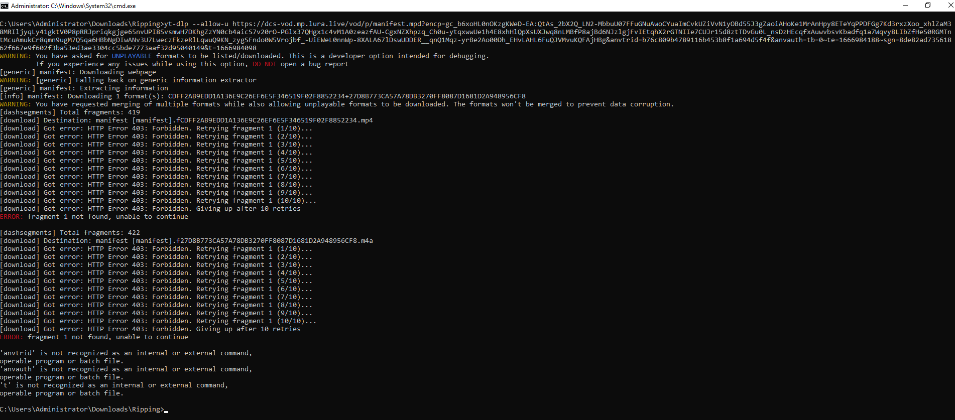 Code:C:\Users\Administrator\Downloads\Ripping\STREAMZ\test3>yt-dlp.exe --allow-u https://dcs-vod.mp.lura.live/vod/p/manifest.mpd?encp=gc_b6xoHL0nOKzgKWeD-EA:QtAs_2bX2Q_LN2-MbbuU07FFuGNuAwoCYuaImCvkUZiVvN1yOBd55J3gZaoiAHoKe1MrAnHpy8ETeYqPPDFGg7Kd3rxzXoo_xhlZaM38MRIljyqLy41gktV0P8pRRJpriqkgjge65nvUPI8SvsmwH7DKhgZzYN0cb4aicS7v20rO-PGlx37QHgx1c4vM1A0zeazfAU-CgxNZXhpzq_Ch0u-ytqxwwUe1h4E8xhHlQpXsUXJwq8nLMBfP8ajBd6NJzlgjFvIEtqhX2rGTNIIe7CUJr15d8ztTDvGu0L_nsDzHEcqfxAuwvbsvKbadfq1a7Wqvy8LIbZfHeS0RGMTntMcuAmukCr8qmn9ugM7Q5qa6HBbNgDIwANv3U7LweczFkzeRlLqwuQ9KN_zygSFndo0W5Vrojbf_-UiEWeL0nnWp-8XALA67lDswUDDER__qnQ1Mqz-yrBe2Ao00Dh_EHvLAHL6FuQJVMvuKQFAjHBg&anvtrid=b76c809b4789116b453b8f1a694d5f4f&anvauth=tb=0~te=1666984188~sgn=8de82ad73561862f667e9f602f3ba53ed3ae3304cc5bde7773aaf32d95040149&t=1666984098 WARNING: You have asked for UNPLAYABLE formats to be listed/downloaded. This is a developer option intended for debugging. If you experience any issues while using this option, DO NOT open a bug report [generic] manifest: Requesting header WARNING: [generic] Falling back on generic information extractor. [generic] manifest: Downloading webpage [generic] manifest: Extracting information [info] manifest: Downloading 1 format(s): CDFF2AB9EDD1A136E9C26EF6E5F346519F02F8852234+27D8B773CA57A78DB3270FF8087D1681D2A948956CF8 WARNING: You have requested merging of multiple formats while also allowing unplayable formats to be downloaded. The formats won't be merged to prevent data corruption. [dashsegments] Total fragments: 419 [download] Destination: manifest [manifest].fCDFF2AB9EDD1A136E9C26EF6E5F346519F02F8852234.mp4 [download] Got server HTTP error: HTTP Error 403: Forbidden. Retrying fragment 1 (attempt 1 of 10) ... [download] Got server HTTP error: HTTP Error 403: Forbidden. Retrying fragment 1 (attempt 2 of 10) ... [download] Got server HTTP error: HTTP Error 403: Forbidden. Retrying fragment 1 (attempt 3 of 10) ... [download] Got server HTTP error: HTTP Error 403: Forbidden. Retrying fragment 1 (attempt 4 of 10) ... [download] Got server HTTP error: HTTP Error 403: Forbidden. Retrying fragment 1 (attempt 5 of 10) ... [download] Got server HTTP error: HTTP Error 403: Forbidden. Retrying fragment 1 (attempt 6 of 10) ... [download] Got server HTTP error: HTTP Error 403: Forbidden. Retrying fragment 1 (attempt 7 of 10) ... [download] Got server HTTP error: HTTP Error 403: Forbidden. Retrying fragment 1 (attempt 8 of 10) ... [download] Got server HTTP error: HTTP Error 403: Forbidden. Retrying fragment 1 (attempt 9 of 10) ... [download] Got server HTTP error: HTTP Error 403: Forbidden. Retrying fragment 1 (attempt 10 of 10) ... ERROR: Giving up after 10 fragment retries ERROR: fragment 1 not found, unable to continue [dashsegments] Total fragments: 422 [download] Destination: manifest [manifest].f27D8B773CA57A78DB3270FF8087D1681D2A948956CF8.m4a [download] Got server HTTP error: HTTP Error 403: Forbidden. Retrying fragment 1 (attempt 1 of 10) ... [download] Got server HTTP error: HTTP Error 403: Forbidden. Retrying fragment 1 (attempt 2 of 10) ... [download] Got server HTTP error: HTTP Error 403: Forbidden. Retrying fragment 1 (attempt 3 of 10) ... [download] Got server HTTP error: HTTP Error 403: Forbidden. Retrying fragment 1 (attempt 4 of 10) ... [download] Got server HTTP error: HTTP Error 403: Forbidden. Retrying fragment 1 (attempt 5 of 10) ... [download] Got server HTTP error: HTTP Error 403: Forbidden. Retrying fragment 1 (attempt 6 of 10) ... [download] Got server HTTP error: HTTP Error 403: Forbidden. Retrying fragment 1 (attempt 7 of 10) ... [download] Got server HTTP error: HTTP Error 403: Forbidden. Retrying fragment 1 (attempt 8 of 10) ... [download] Got server HTTP error: HTTP Error 403: Forbidden. Retrying fragment 1 (attempt 9 of 10) ... [download] Got server HTTP error: HTTP Error 403: Forbidden. Retrying fragment 1 (attempt 10 of 10) ... ERROR: Giving up after 10 fragment retries ERROR: fragment 1 not found, unable to continue 'anvtrid' is not recognized as an internal or external command, operable program or batch file. 'anvauth' is not recognized as an internal or external command, operable program or batch file. 't' is not recognized as an internal or external command, operable program or batch file. -