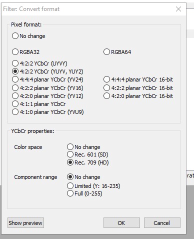 No idea, sorry. I do not use VirtualDub or any other useless GUI for cropping/addborders/resizing/change matrix, just AviSynth, where you have full control. Maybe Sharc can help here...Tried this in VDub, no joy, it just spits out "BT470". Any suggestions?
