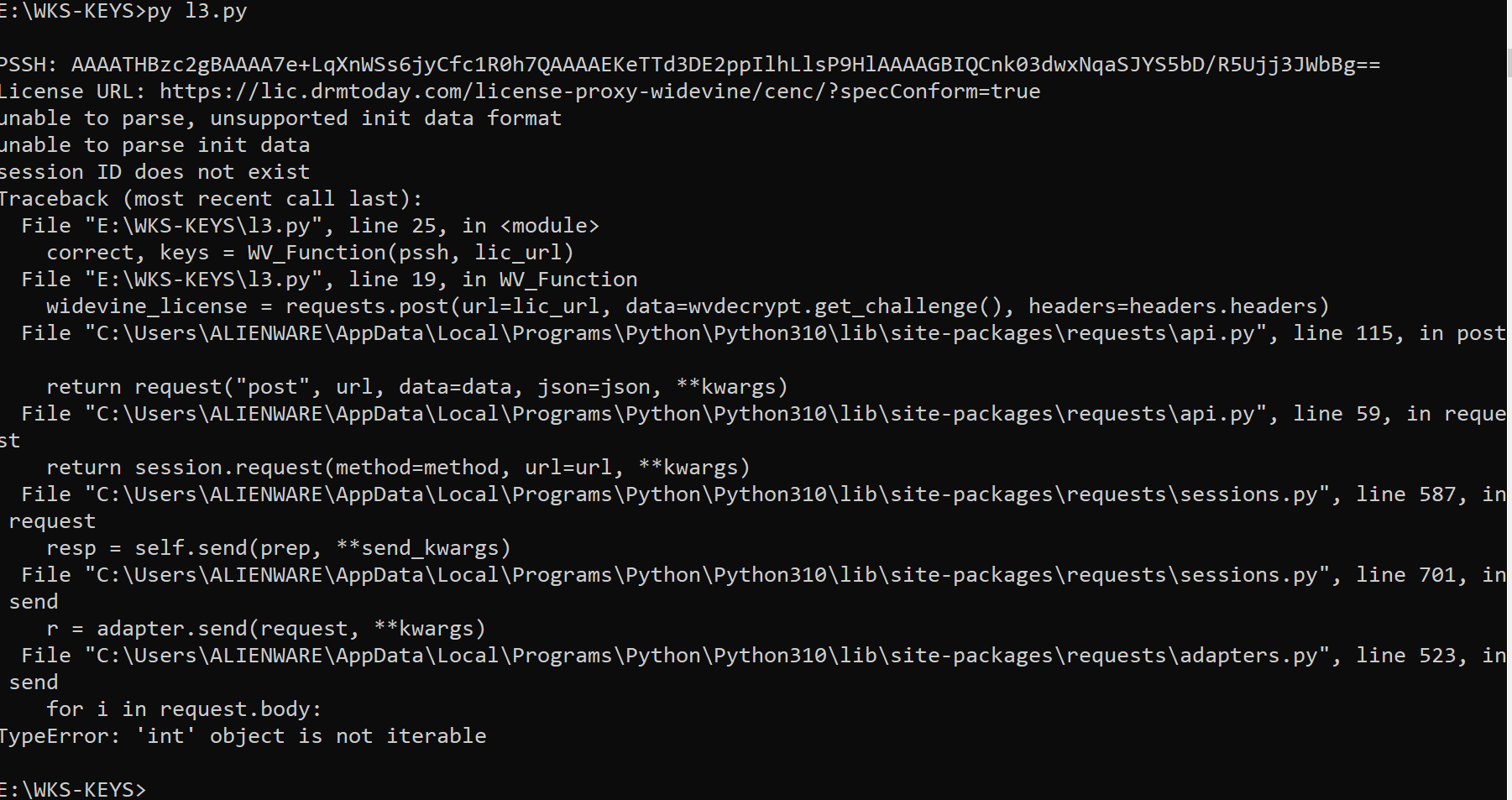 1. The only thing that should be in your headers.py file should be the headers dictionary (headers = { 'Accept': '*/*', ... }) you got from curlconverter or otherwise you end up making an extra unneeded request to the license server. Recently, I kept getting 403s from dr't'day if my script sent a request too soon after my browser sent one. YMMV but the request in headers.py adds no benefit either way.