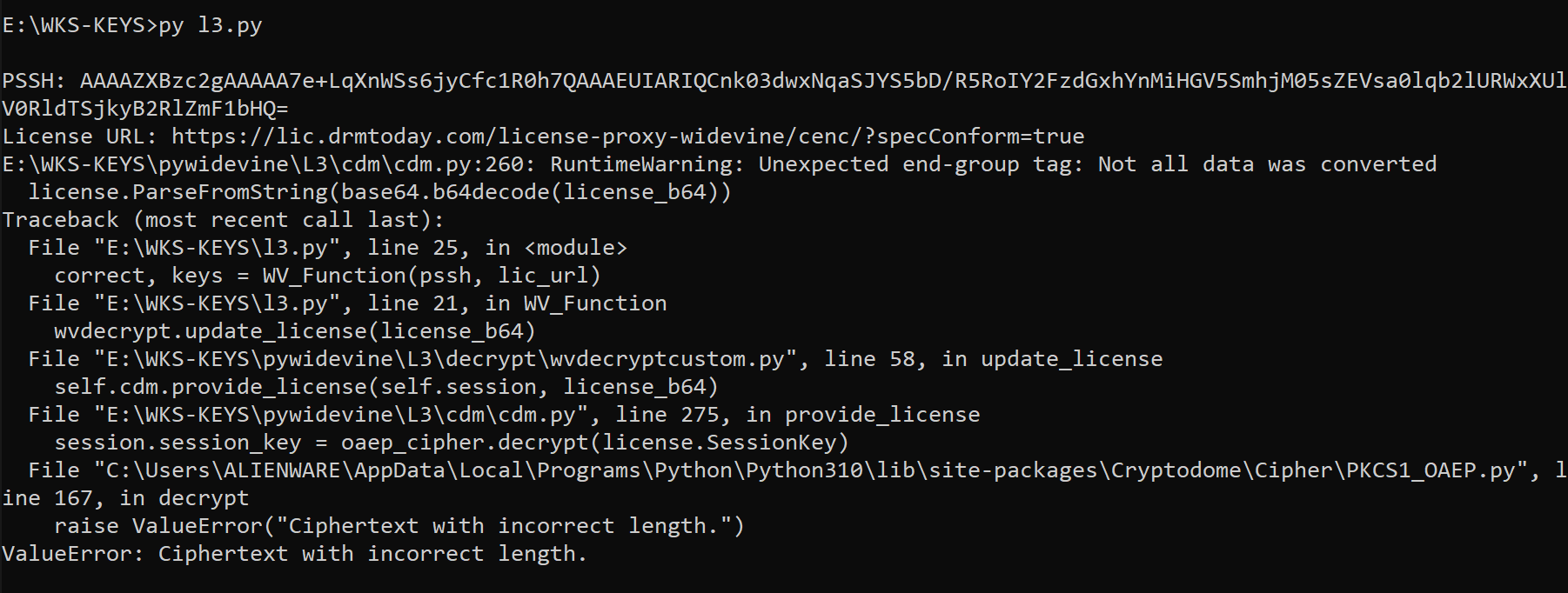 2. Yeah, I'm going to hazard a guess your generated PSSH is useless if that's what pywidevine is saying before WKS has even tried sending it to the license server. I'm not typing in your PSSH by hand, and I'm not particularly au fait with Protobufs anyway so I wouldn't be able to tell you anything of substance, but I would be surprised if PSSH Box Generator gave it the all-clear. Unless there's a specific reason you need to generate the PSSH outside of the browser, just use Firefox/Chrome/Brave/Opera/Vivaldi (but not Edge) with the EME Logger userscript and use the PSSH inside the generateRequest line in your browser's devtools console.