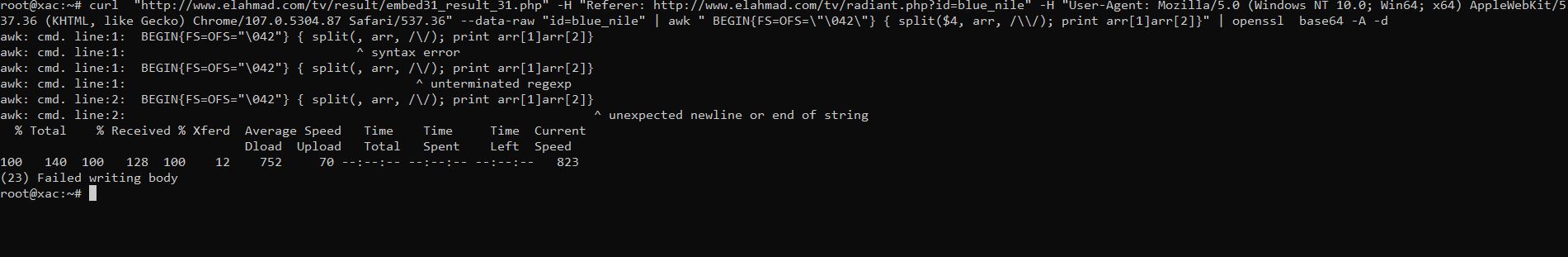 Code:curl "http://www.elahmad.com/tv/result/embed31_result_31.php" -H "Referer: http://www.elahmad.com/tv/radiant.php?id=blue_nile" -H "User-Agent: Mozilla/5.0 (Windows NT 10.0; Win64; x64) AppleWebKit/537.36 (KHTML, like Gecko) Chrome/107.0.5304.87 Safari/537.36" --data-raw "id=blue_nile" | awk " BEGIN{FS=OFS=\"\042\"} { split($4, arr, /\\/); print arr[1]arr[2]}" | openssl base64 -A -d -