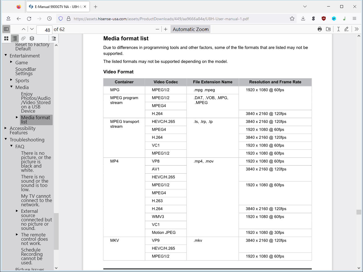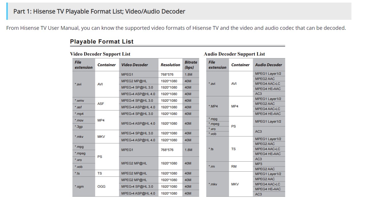 And the list goes on for a few more pages. The list is very different the the one you quoted. I got my link from the hisense-usa.com web site. It's hard to believe any modern TV with a built in media player wouldn't support h.264. That's the common video codec now.