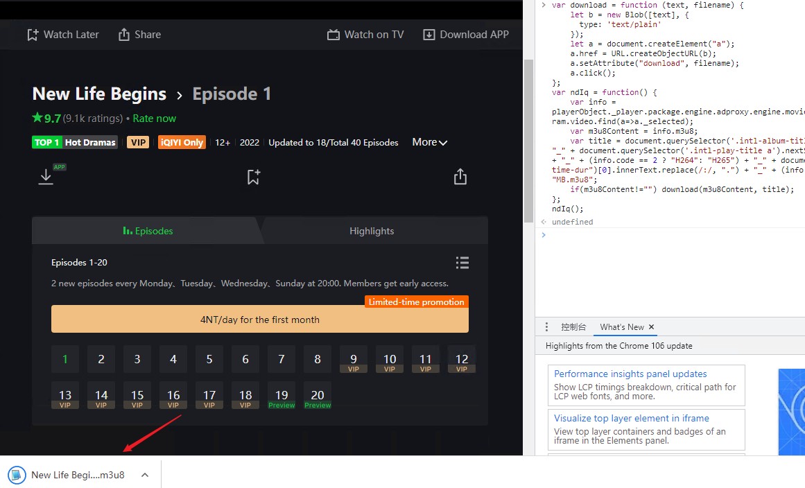 Run the code in console, Then download it with m3u8 downloader like N_m3u8DL-RECode:var download = function (text, filename) { let b = new Blob([text], { type: 'text/plain' }); let a = document.createElement("a"); a.href = URL.createObjectURL(b); a.setAttribute("download", filename); a.click(); }; var ndIq = function() { var info = playerObject._player.package.engine.adproxy.engine.movieinfo.current.originalData.data.program.video.find(a=>a._selected); var m3u8Content = info.m3u8; var title = document.querySelector('.intl-album-title span span').innerText.trim() + "_" + document.querySelector('.intl-play-title a').nextSibling.nodeValue + "_" + info.scrsz + "_" + (info.code == 2 ? "H264": "H265") + "_" + document.getElementsByClassName("iqp-time-dur")[0].innerText.replace(/:/, ".") + "_" + (info.vsize / 1024 / 1024).toFixed(2) + "MB.m3u8"; if(m3u8Content!="") download(m3u8Content, title); }; ndIq();