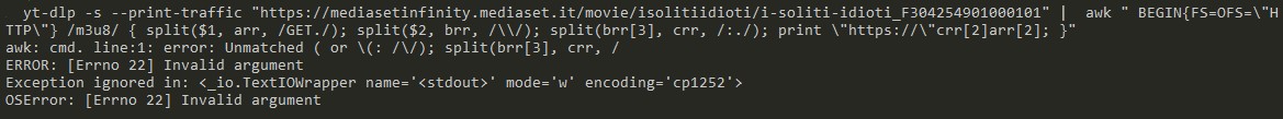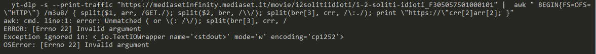 but have the same previous error:Code:yt-dlp -s --print-traffic "https://mediasetinfinity.mediaset.it/movie/i2solitiidioti/i-2-soliti-idioti_F305057501000101" | awk " BEGIN{FS=OFS=\"HTTP\"} /m3u8/ { split($1, arr, /GET./); split($2, brr, /\\/); split(brr[3], crr, /\:./); print \"https://\"crr[2]arr[2]; }"