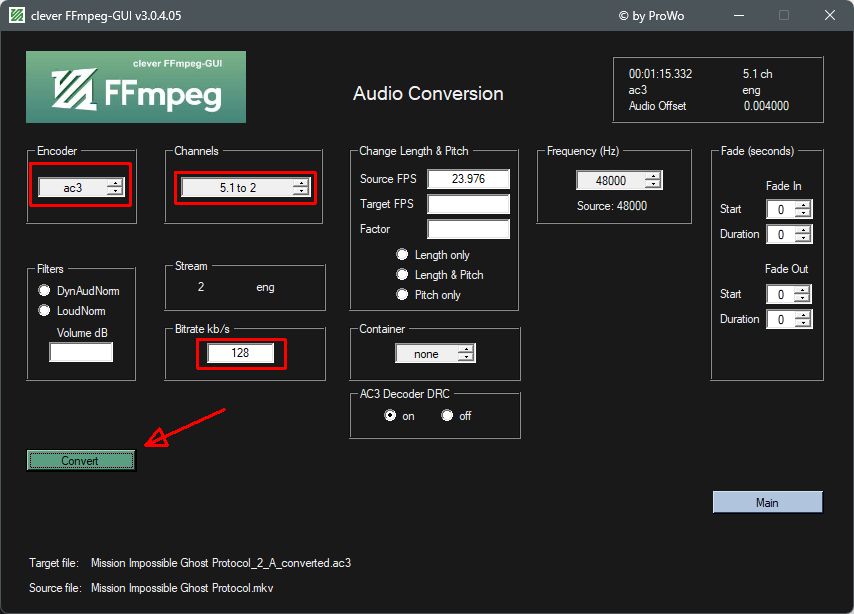Load your ENG_FILM.mp4, click main, click convert Audiostream, select the AAC 5.1 Stream, click go to the encoder, then set all like in the picture below, signed in red. Leave all other settings as they are.