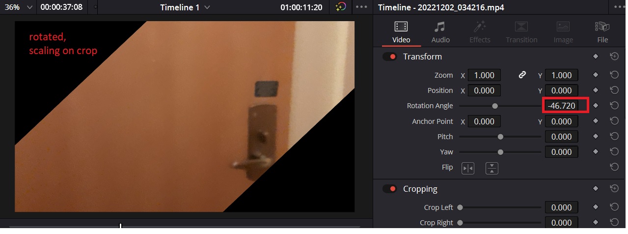 It doesn't matter what program you use (the below screenshots are not from Resolve), if you want 16:9 and no black, you'll end up with something like this. You'll have to zoom in a fair way, which will, of course, require re-encoding.