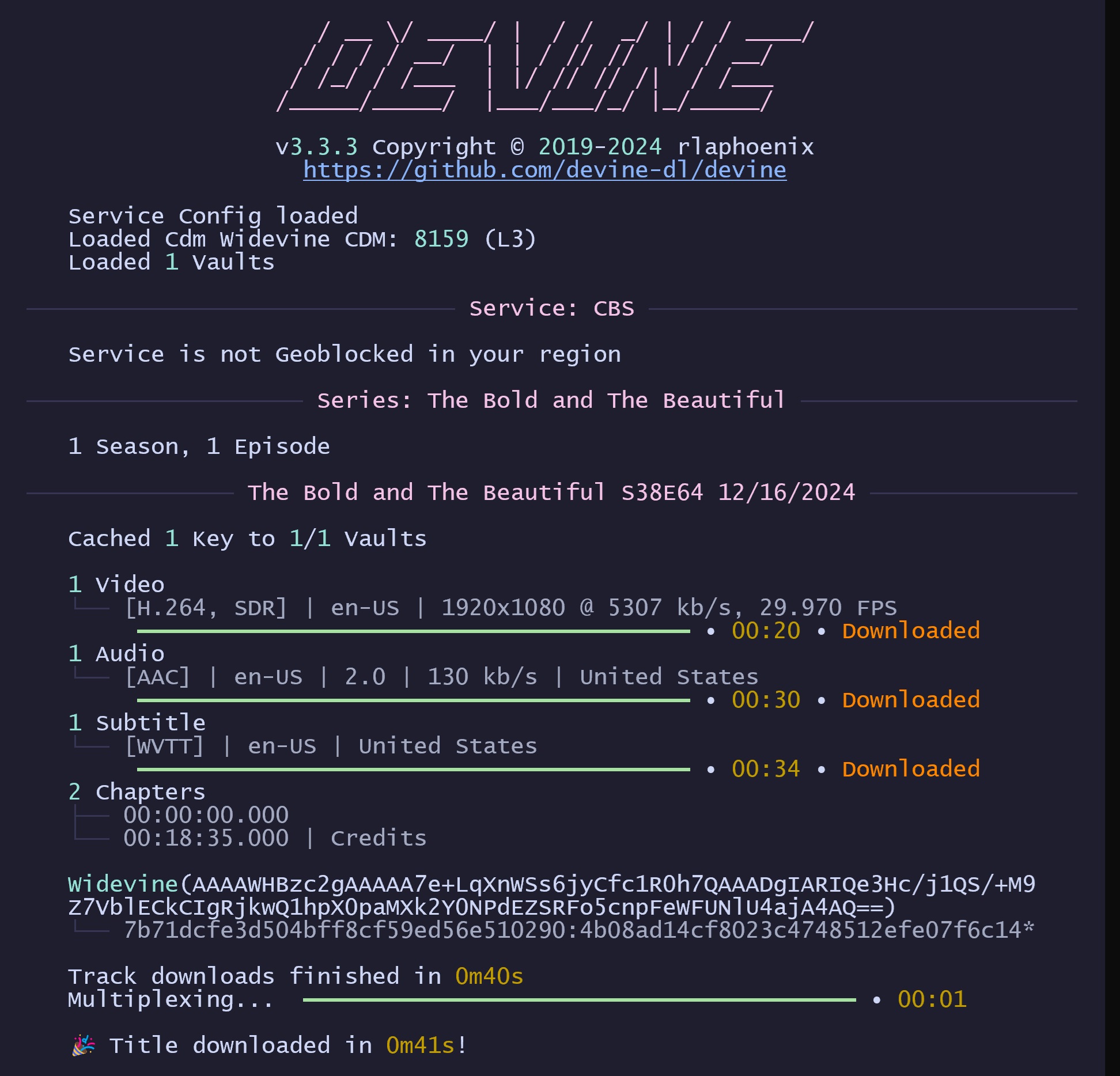 Was able to get it ok with Devine, so clearly that's doing something slightly different. Will need to have a poke at what's going on.Code:Enter the CBS video URL: https://www.cbs.com/shows/video/F90CXi_JZ1y6cCOtFRDZ9rzEyaT6U8j0/ MPD URL: https://vod-gcs-cedexis.cbsaavideo.com/intl_vms/2024/12/13/2395344451892/3028413_cenc_dash/stream.mpd License URL: https://cbsi.live.ott.irdeto.com/widevine/getlicense?CrmId=cbsi&AccountId=cbsi&SubContentType=Default&ContentId=F90CXi_JZ1y6cCOtFRDZ9rzEyaT6U8j0 PSSH: AAAAWHBzc2gAAAAA7e+LqXnWSs6jyCfc1R0h7QAAADgIARIQe3Hc/j1QS/+M9Z7VblECkCIgRjkwQ1hpX0paMXk2Y0NPdEZSRFo5cnpFeWFUNlU4ajA4AQ== Failed to get keys for: https://www.cbs.com/shows/video/F90CXi_JZ1y6cCOtFRDZ9rzEyaT6U8j0/ Error: 403 Client Error: Forbidden for url: https://cbsi.live.ott.irdeto.com/widevine/getlicense?CrmId=cbsi&AccountId=cbsi&SubContentType=Default&ContentId=F90CXi_JZ1y6cCOtFRDZ9rzEyaT6U8j0