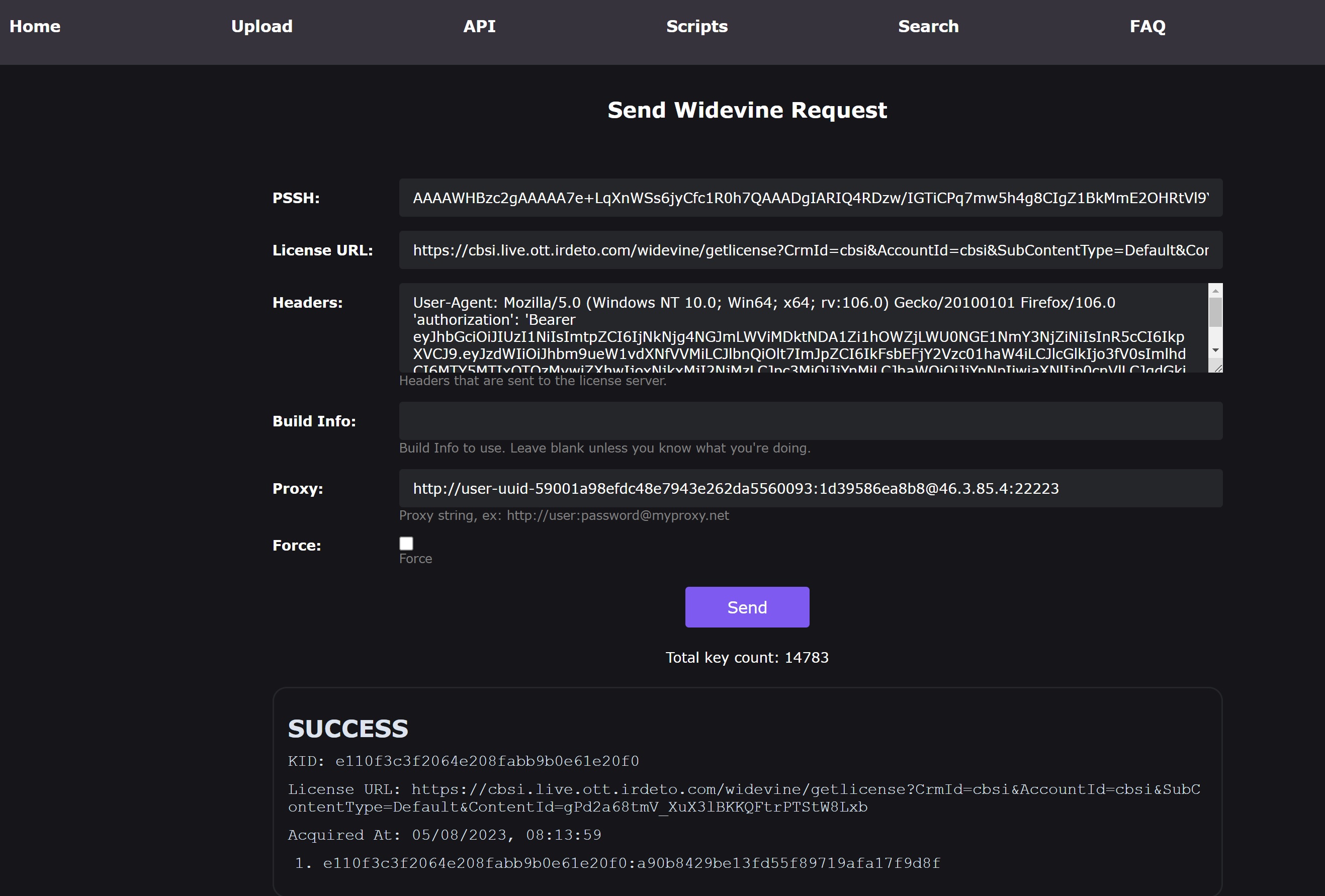 YES iamghost, THANK YOU!! The "Authorization:Bearer ..." string added to the HEADERS was the final missing piece I needed! I never would have known to add that. [That's why you're the expert and I'm the noob.] BTW, I did not need the PROXY. This worked at "https://keysdb.net" and "http://172.106.17.134:8080". Have not yet verified "https://getwvkeys.cc" as I'm still waiting for approval.