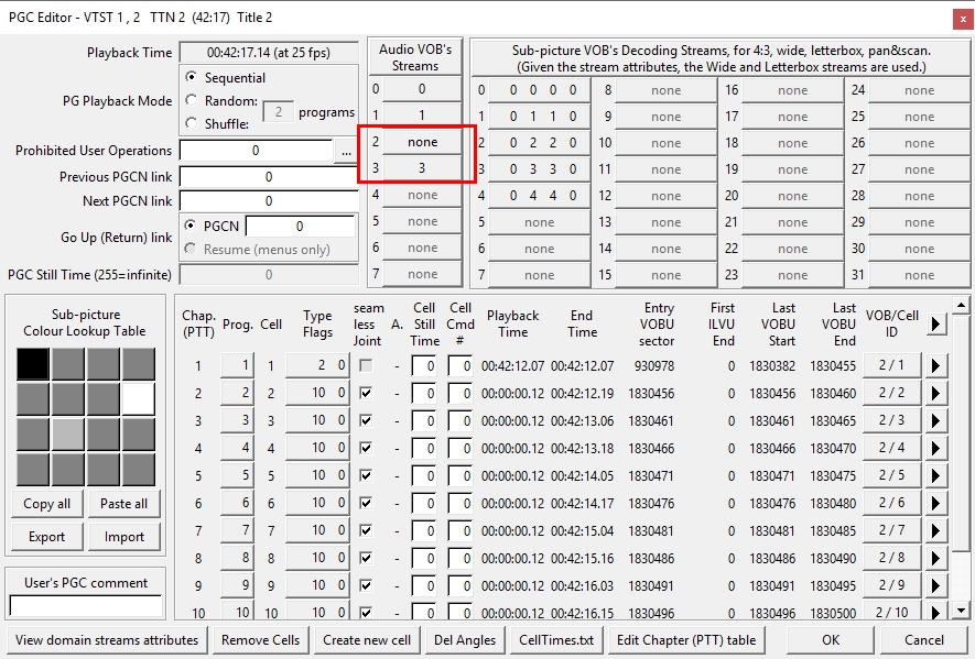 Don't forget to also verify the track attributes. Right-click on the PGC in the left pane of the main window, and select "Domain track attributes". All audio streams for that domain must be defined here as well, and have the correct attributes.
