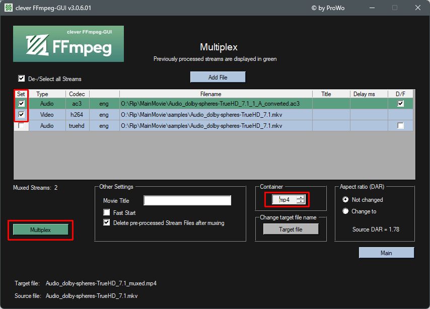 Then click multiplex, the new created audiostream is shown in green, check it and the videostream, uncheck the original audiostream shown in blue.