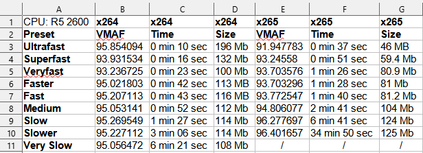 From the screenshot the file size to quality (VMAF) between the two is roughly the same, especially the slower the preset goes, even though the encode times have increased. This is the opposite of what I expected. It seems there is a noticeable difference in the Superfast file size for seemingly the same quality (at least in this specific clip), but people usually recommend a lot slower presets. Obviously I have to be missing something here, I'm assuming the common notion that you get the same quality at a smaller file probably has something to do with custom arguments? Or maybe just one test file doesn't give representative results? I guess now that I'm looking at everything maybe I would get a smaller file size if I ran the encodes with a fixed bitrate? Any clarification would be appreciated.
