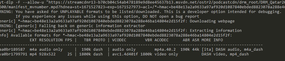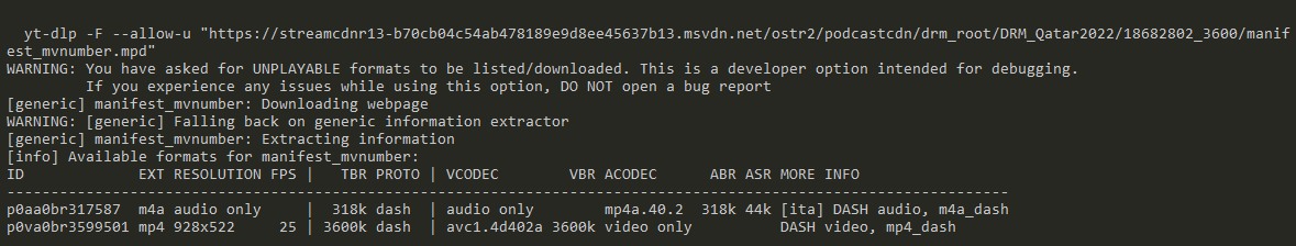 And than I tried withCode:yt-dlp --allow-u https://streamcdnr13-b70cb04c54ab478189e9d8ee45637b13.msvdn.net/ostr2/podcastcdn/drm_root/DRM_Qatar2022/18682802_3600/manifest_mvnumber.mpd