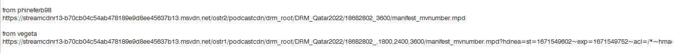 Code:https://streamcdnr13-b70cb04c54ab478189e9d8ee45637b13.msvdn.net/ostr1/podcastcdn/drm_root/DRM_Qatar2022/18682802_,1800,2400,3600/manifest_mvnumber.mpd?hdnea=st=1671549602~exp=1671549752~acl=/*~hmac=cd8832063a2f1dbc5f18ffe2edd39d11e0b1765b53eadb8b8f25f1d653eb79d8p