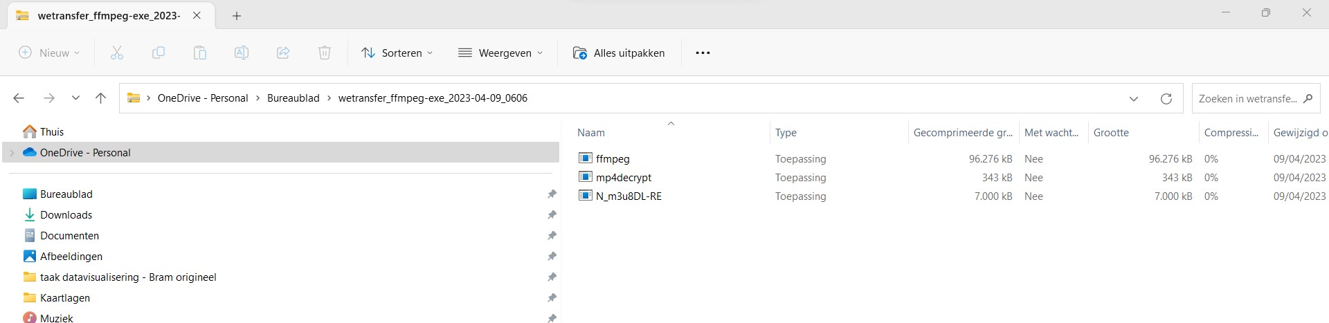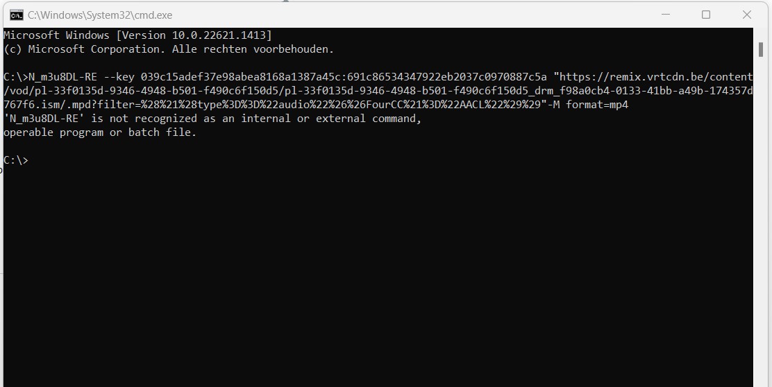 This is a code that you put in cmd or command prompt. When you are inside the folder where the 3 tools you downloaded are, just go to the address bar above and type cmd and press enter. It will open the command prompt.Code:N_m3u8DL-RE --key e6c83af4f48b850ae3b8eced3ea32ba3:aa986877706b5955b131a80cd91b346d "https://remix.vrtcdn.be/content/vod/pl-c8bb635e-191d-4c9d-bcea-11400b8cc8fc/pl-c8bb635e-191d-4c9d-bcea-11400b8cc8fc_drm_29022c14-beb4-4072-845a-32e88726d5ce.ism/.mpd?filter=%28%21%28type%3D%3D%22audio%22%26%26FourCC%21%3D%22AACL%22%29%29" -M format=mp4