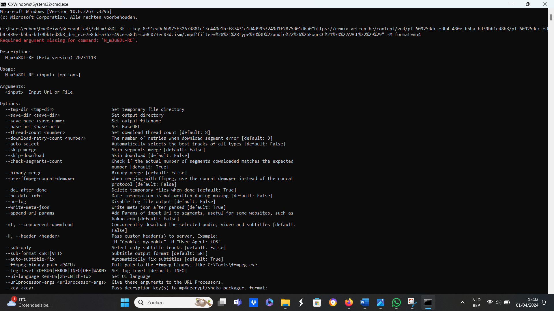 have a good look at the spaces between different words/valuesCode:N_m3u8DL-RE MPDURL --key KEY -M format=mp4