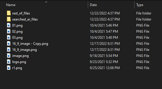 Code:from subprocess import Popen, PIPE import json from pathlib import Path import shutil #https://mediaarea.net/en/MediaInfo/Download/Windows MEDIAINFO = r"F:\tools\MediaInfo_CLI_22.09_Windows_x64\MediaInfo.exe" DIRECTORY = r"F:\testing aspet ratio for images\images" EXTENSION = "PNG" SEARCHED_ASPECT_RATIO = 16/9 generator_of_paths = Path(DIRECTORY).glob(f'*.{EXTENSION}') #generator is a better choise as oppose to using list dir_searched_ar = Path(DIRECTORY) / 'searched_ar_files' dir_searched_ar.mkdir(parents=True, exist_ok=True) #creates that subdirectory if it does not exist dir_rest = Path(DIRECTORY) / 'rest_of_files' dir_rest.mkdir(parents=True, exist_ok=True) for path in generator_of_paths: cmd = f'"{MEDIAINFO}" --Output=JSON "{path}"' p = Popen(cmd, stderr=PIPE, stdout=PIPE) stdout, stderr = p.communicate() data = json.loads(stdout) #conversion from stdout(it is json format), to python's dictionary object ## print(json.dumps(data, indent=2)) #use this, it prints pretty, formatted, to orient yourself in that dictionary width = data['media']['track'][1]['Width'] #[0] means general section, [1] is for file properties if image or video height = data['media']['track'][1]['Height'] ar = int(width)/int(height) if SEARCHED_ASPECT_RATIO-0.1 < ar < SEARCHED_ASPECT_RATIO+0.1: shutil.copy2(path, dir_searched_ar) else: shutil.copy2(path, dir_rest)