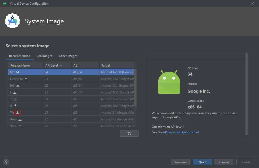 Download the Android Version you want for your virtual device, choose it and click on "next"