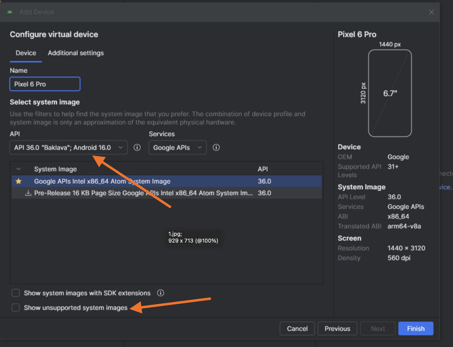 Regardless, the mistake you're making (in the picture you attached, which I marked up below) is that you are going with the default system image, which for your device, is API 36 or something like that. Click on the dropdown box (where it gives you the choice of API, see red arrow) and select something earlier. If you're still finding nothing, then try clicking the "show unsupported" checkbox at the bottom (red arrow #2). If all else fails, then change your device to something that actually supported that API -- eg, the pixel 3 XL.