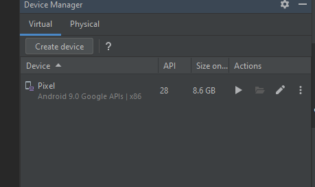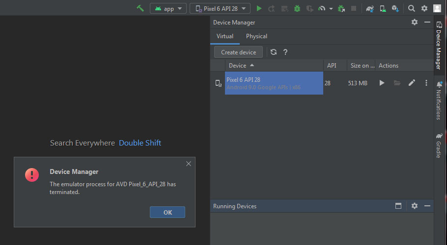 "Device Manager / The emulator process for AVD Pixel_6_API_28 has terminated."