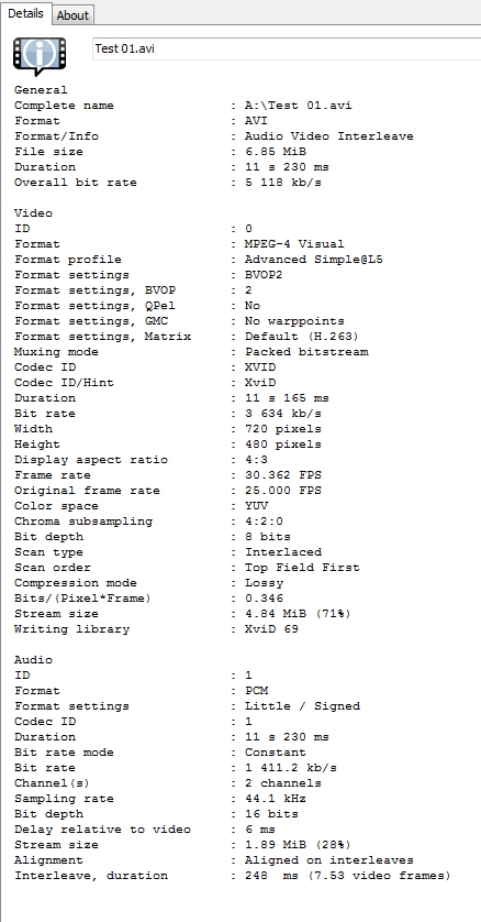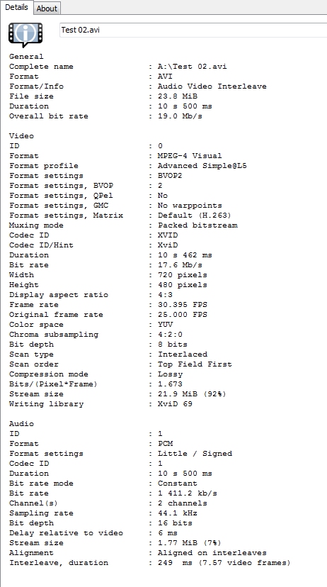 I left two files with the specifications of each file, one in the maximum quality of the Xvid codec and another of the same snippet from the VHS NTSC tape at a quality close to maximum of the Xvid codec that does not generate a huge AVI file (and that one I usually do more that way, because I see that the final quality is the same.)