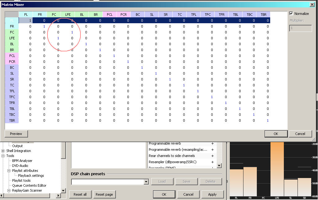 Swapping the Center and LFE channels, just to demonstrate.